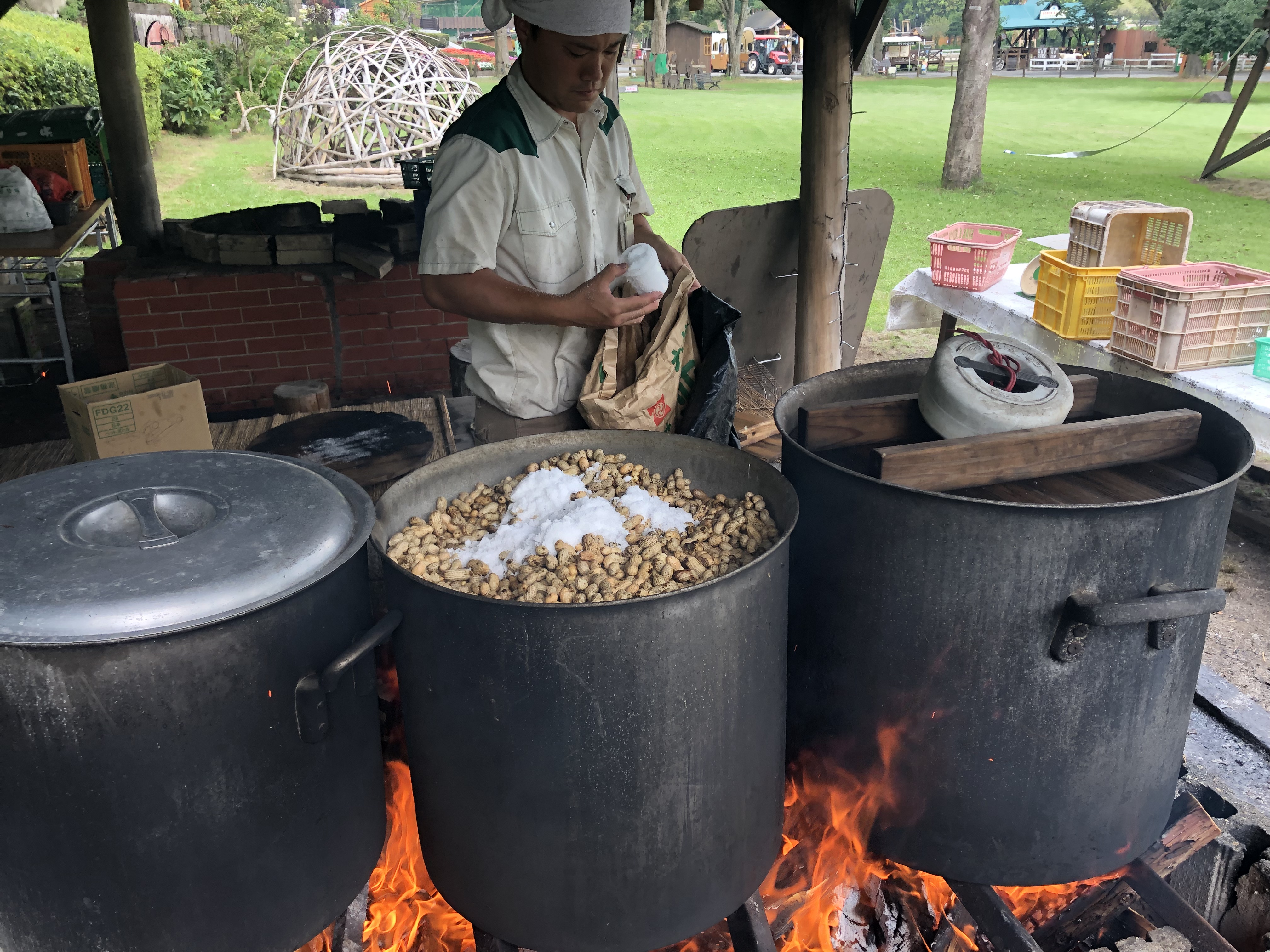 秋~冬に販売する用の茹で落花生をたき火の炎で一気に作る!