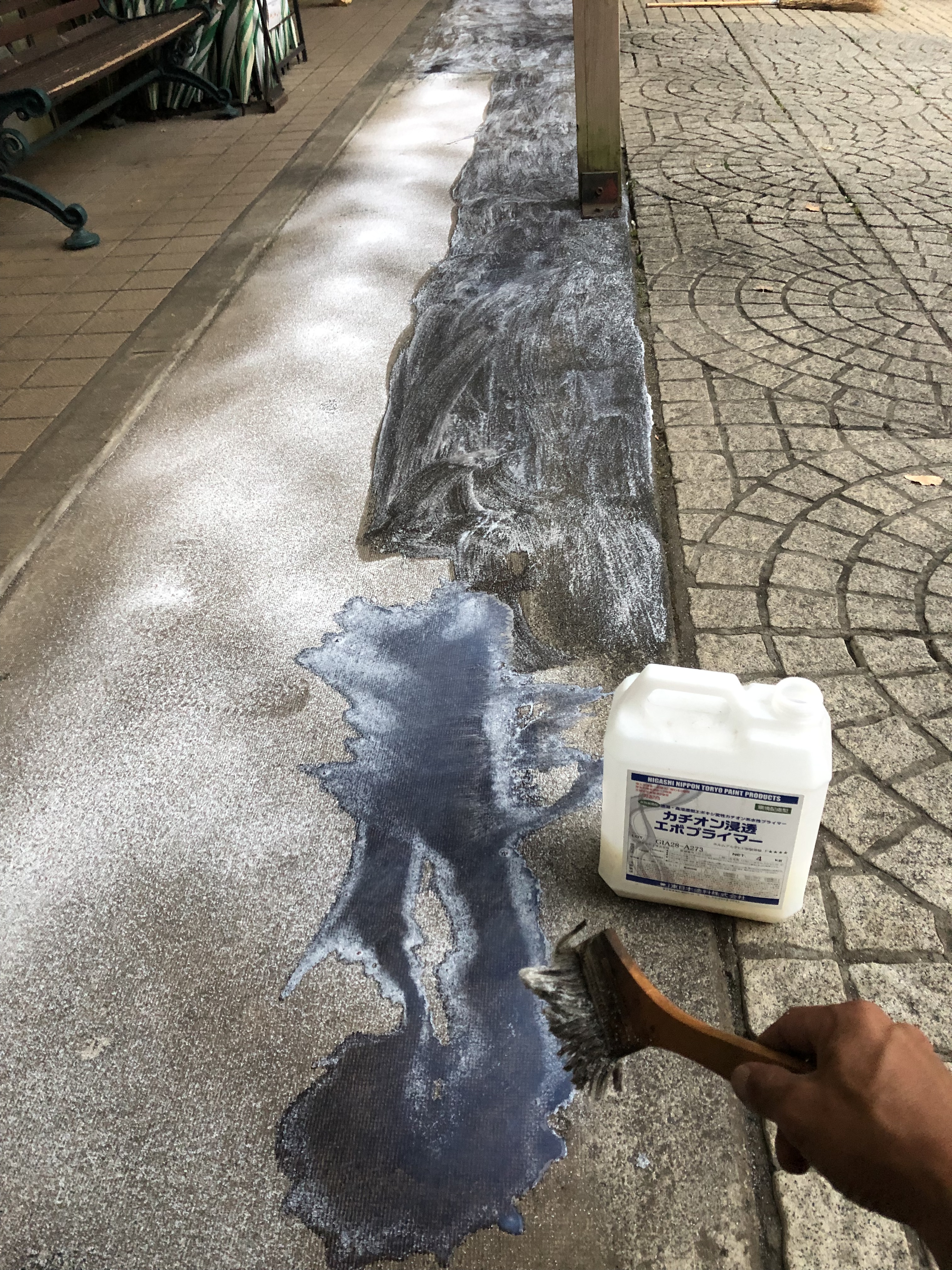 昨日の夕方、滑らない粉をまいて、しみこんで固まる特殊塗料を塗りたくる。