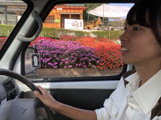 トダお姉さんが堆肥運搬車両の運転、合格を目指して努力中。