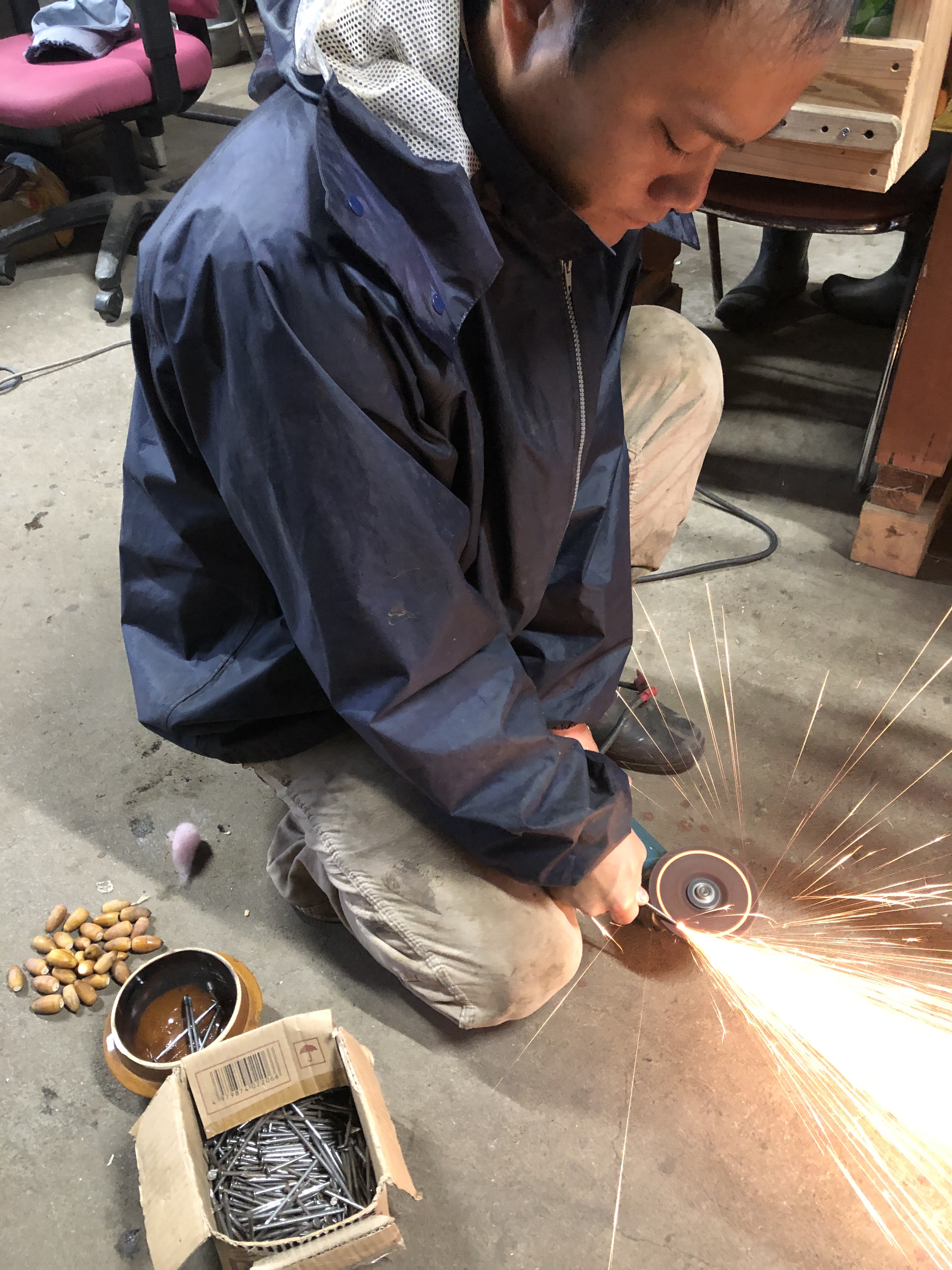 クギの先をグラインダーで削りつつ、少し溶かす。