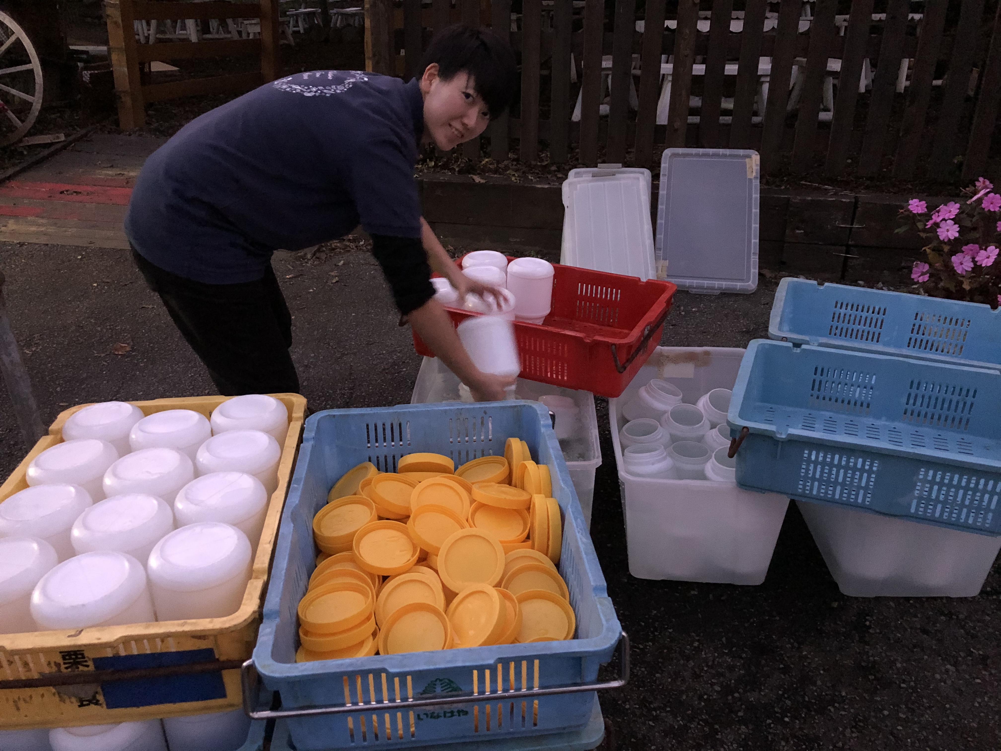 アイス作りの容器を、全部順番に塩素につけて完全消毒作業中。