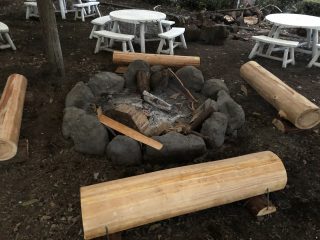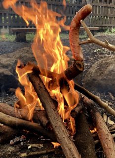 ソーセージを棒の先に刺し、たき火であぶりながら