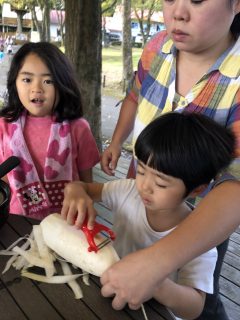 アキラ君、お母さんに教わりながらピーラーで大根の皮をむく♪