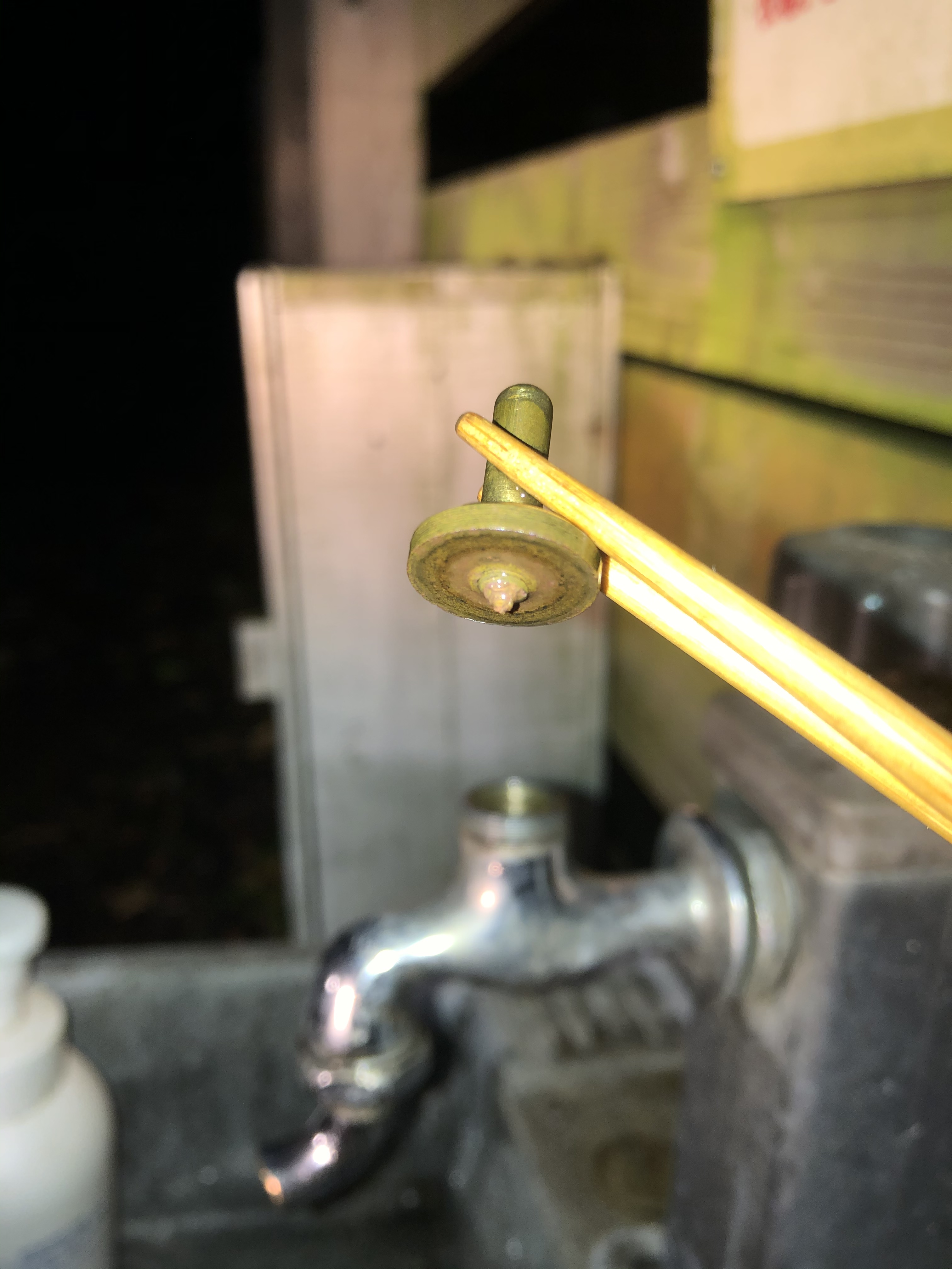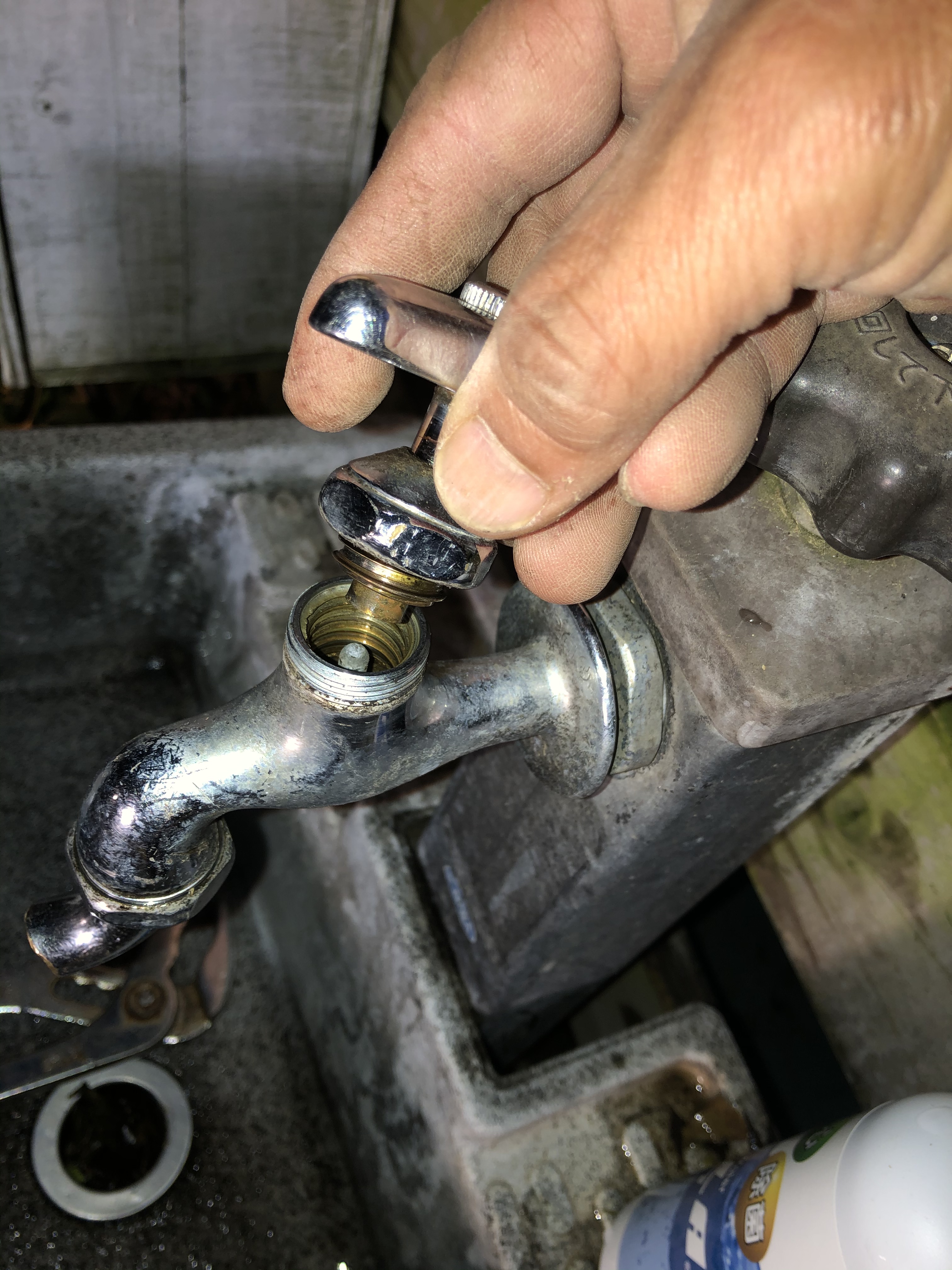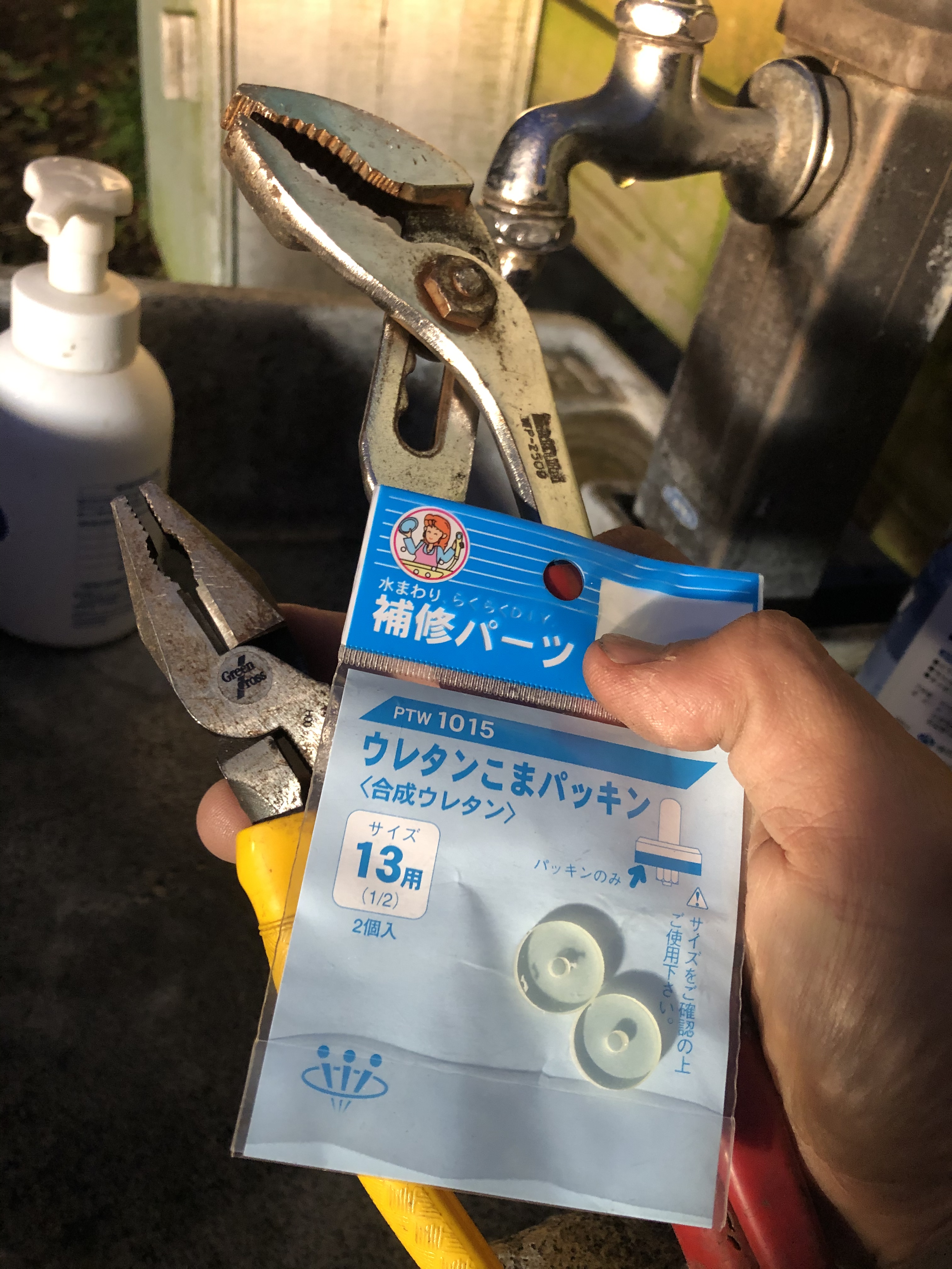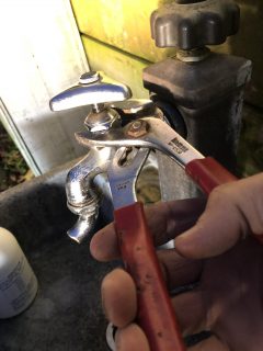 ※もう一つのペンチは、ここでパッキンを交換するために、2つの工具で「写真の小さなナット↑」を回すのに使います。