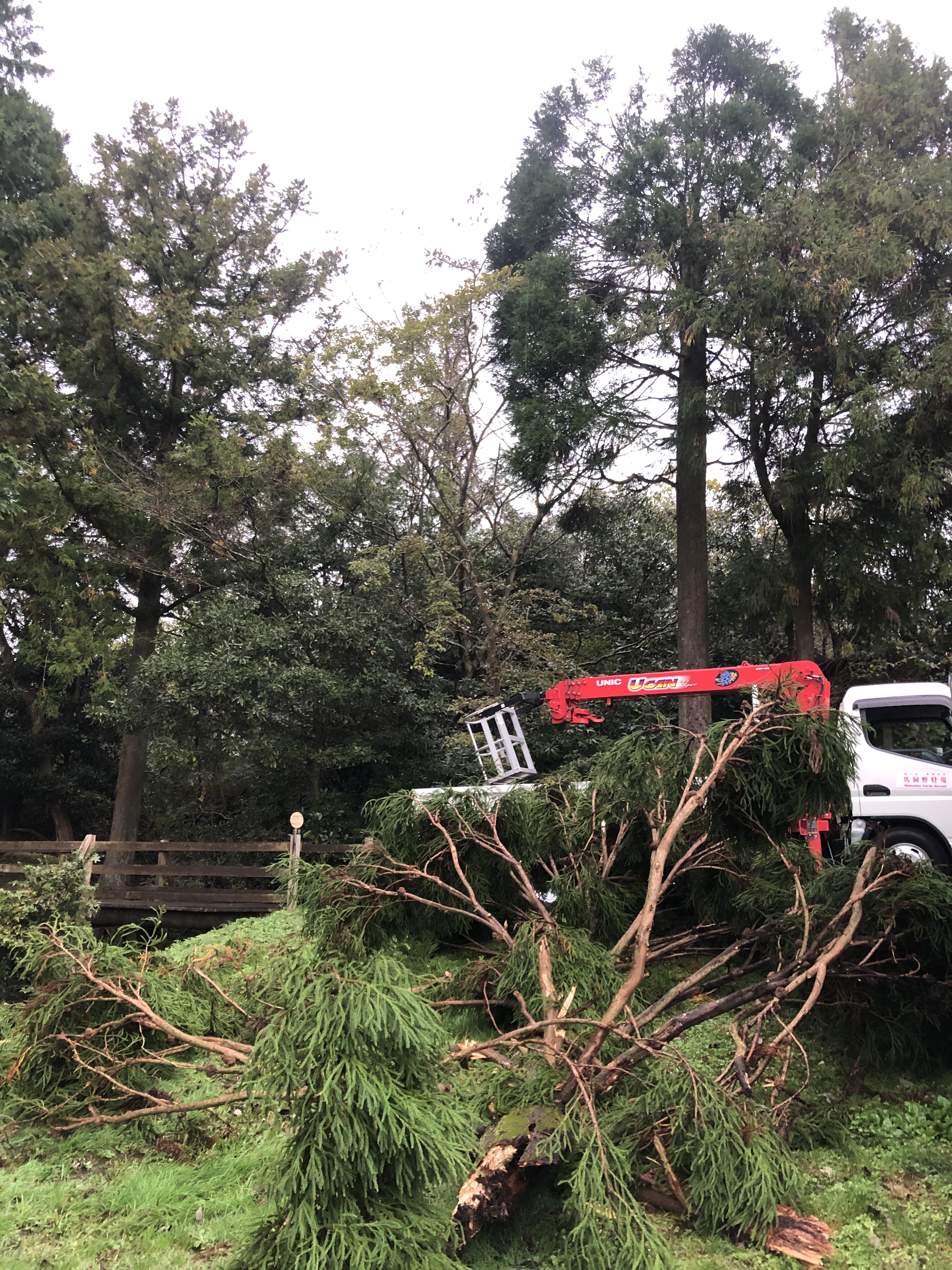 写真奥のスギ、先日の大風で上半分がブチ折れて、