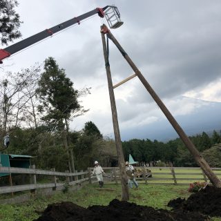 台風がくるくると言って、こなかったので、人手と部材をそろえて一気に柱を立てる!