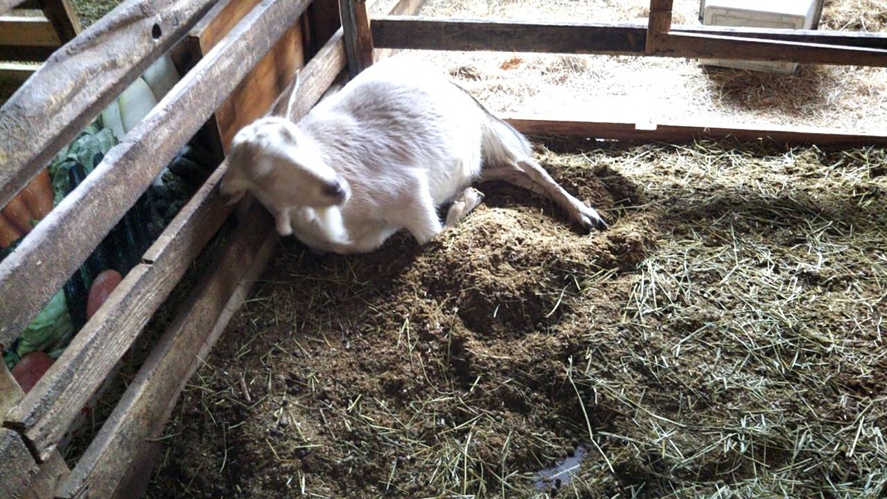 11時前ごろ、ヤギのオトヒメさんが横になってくるしそう・・