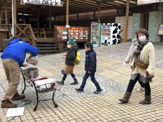 入場口前に、事務所のハルカお姉さん中心にバレンタインに向けた