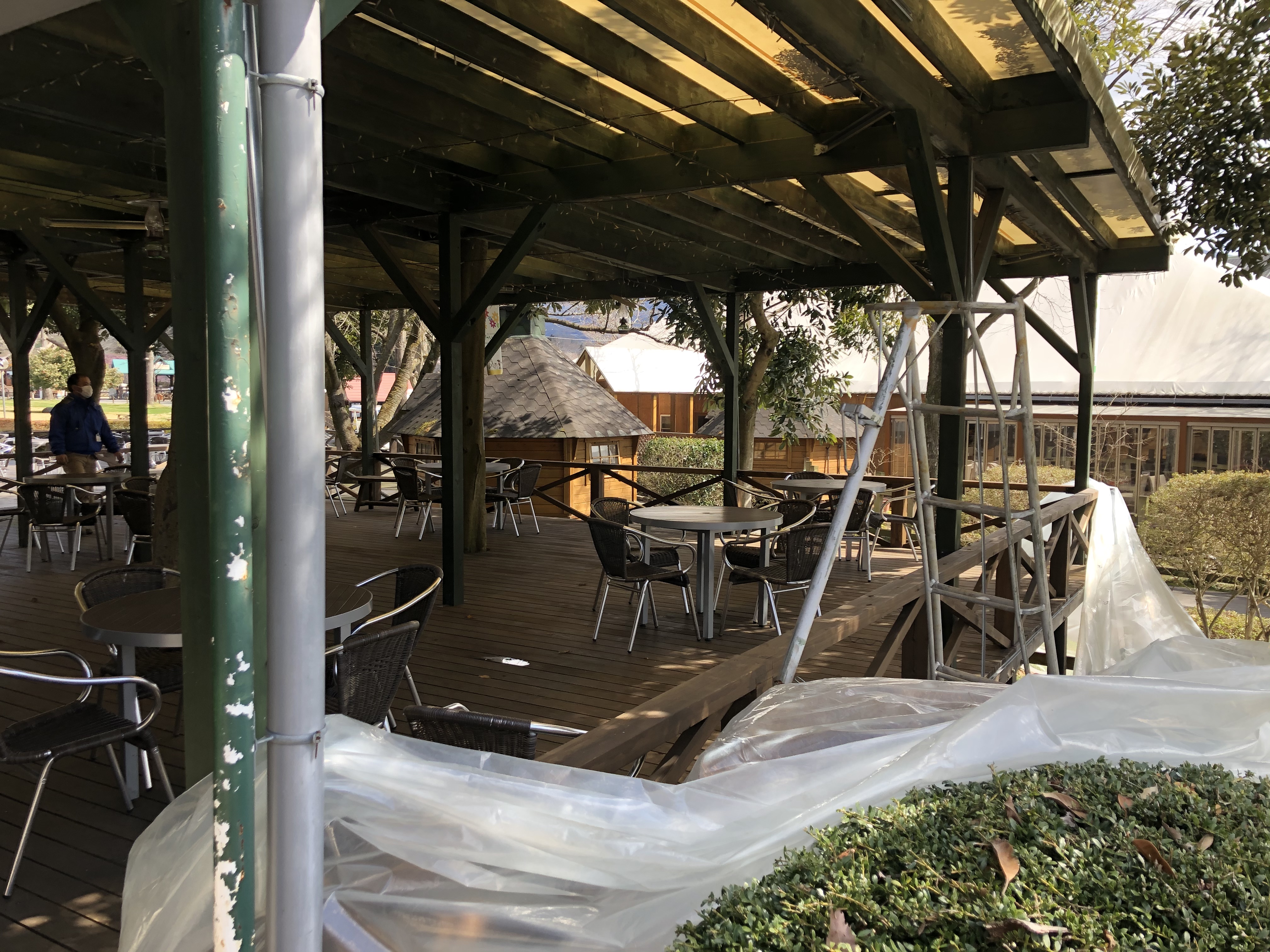 食の体験工房前の風よけシートを除く。