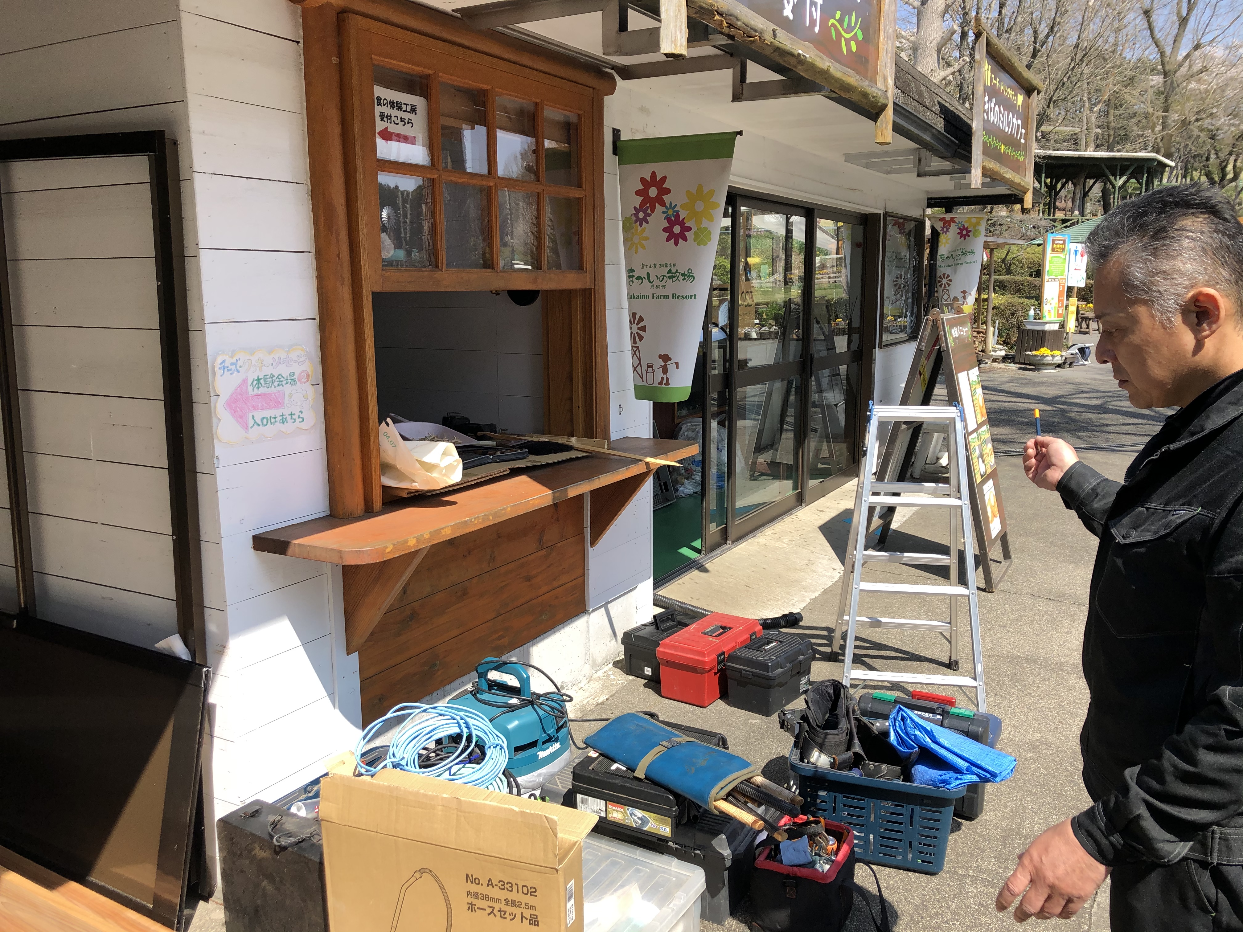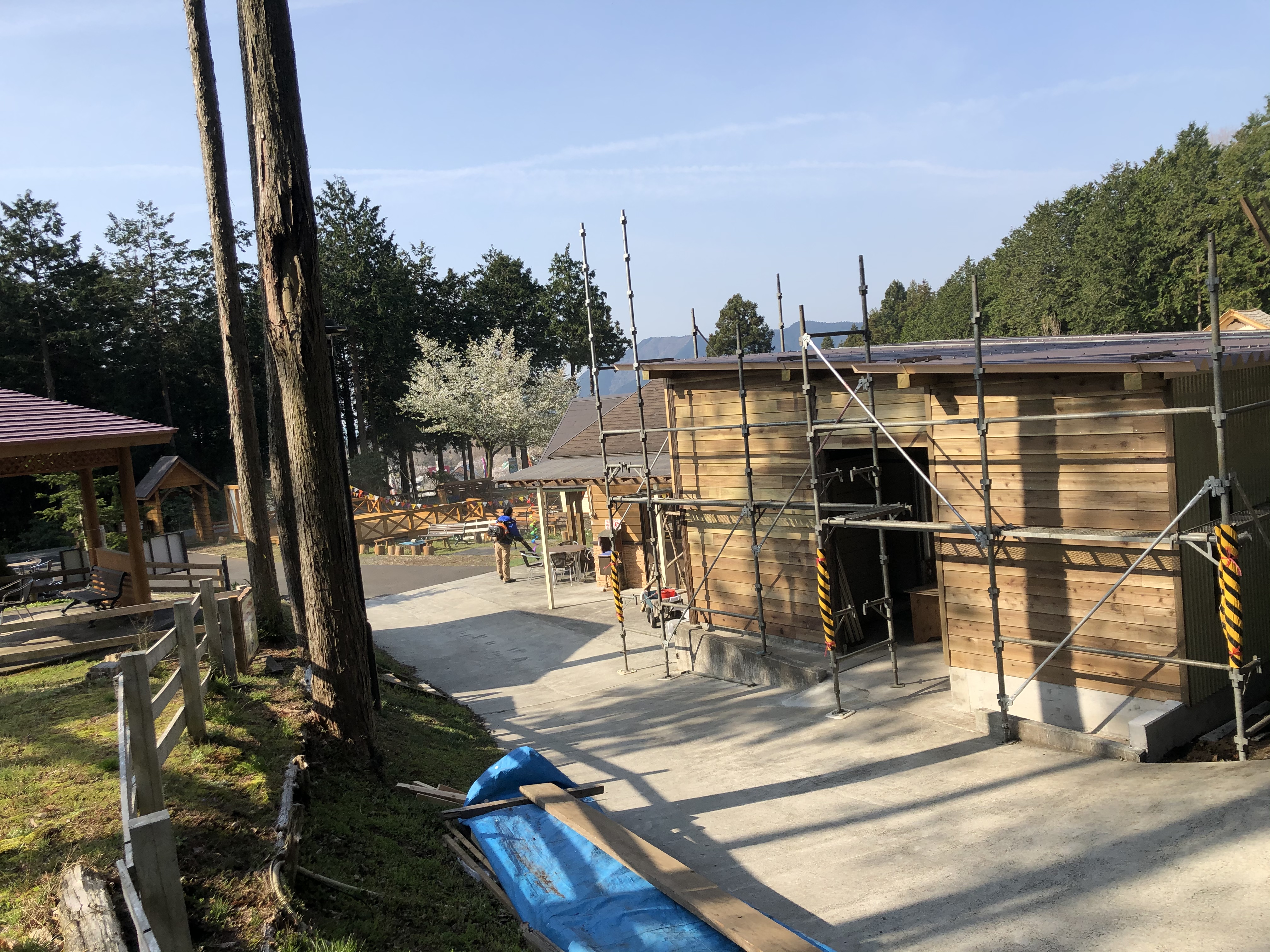 イノウエお兄さんがブロアーで朝の掃除中。(中央奥)