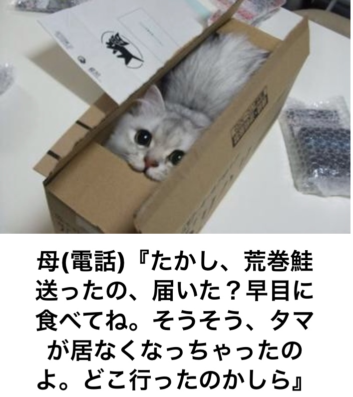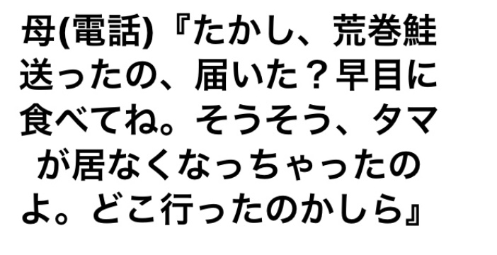 郷里から電話してきた母のセリフ【たかし、新巻ジャケ送ったの、届いた?早めに食べてね。そうそう、タマが居なくなっちゃったのよ。どこいったのかしら】