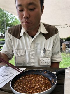 自分たちが育てたニンニクやタマネギを使って作る食べるラー油が完成した。