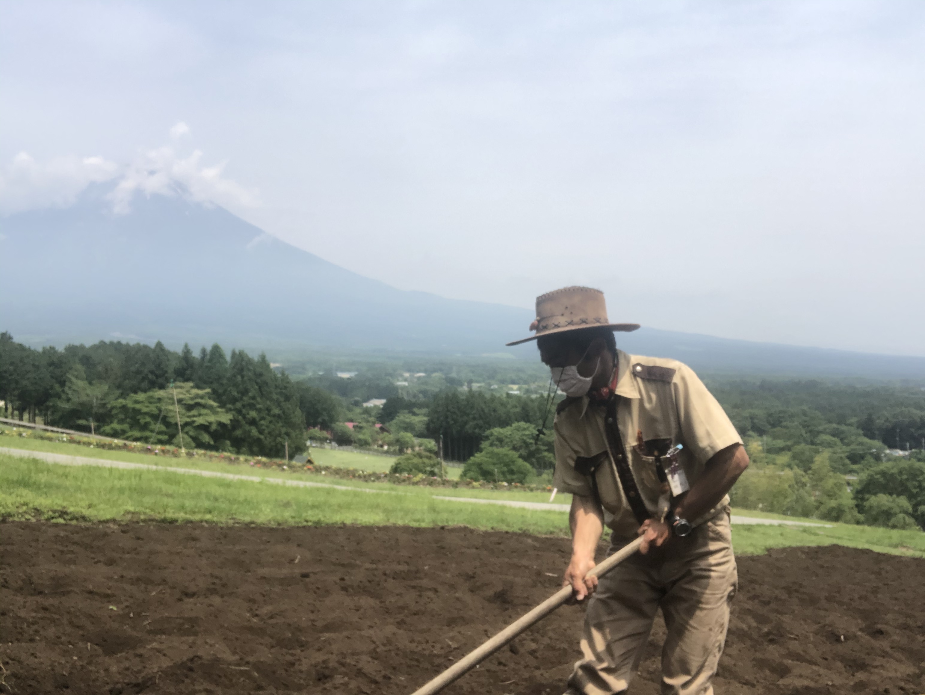 「青い花畑」と「あおい芝生」と「青い空」と「青い富士山」の