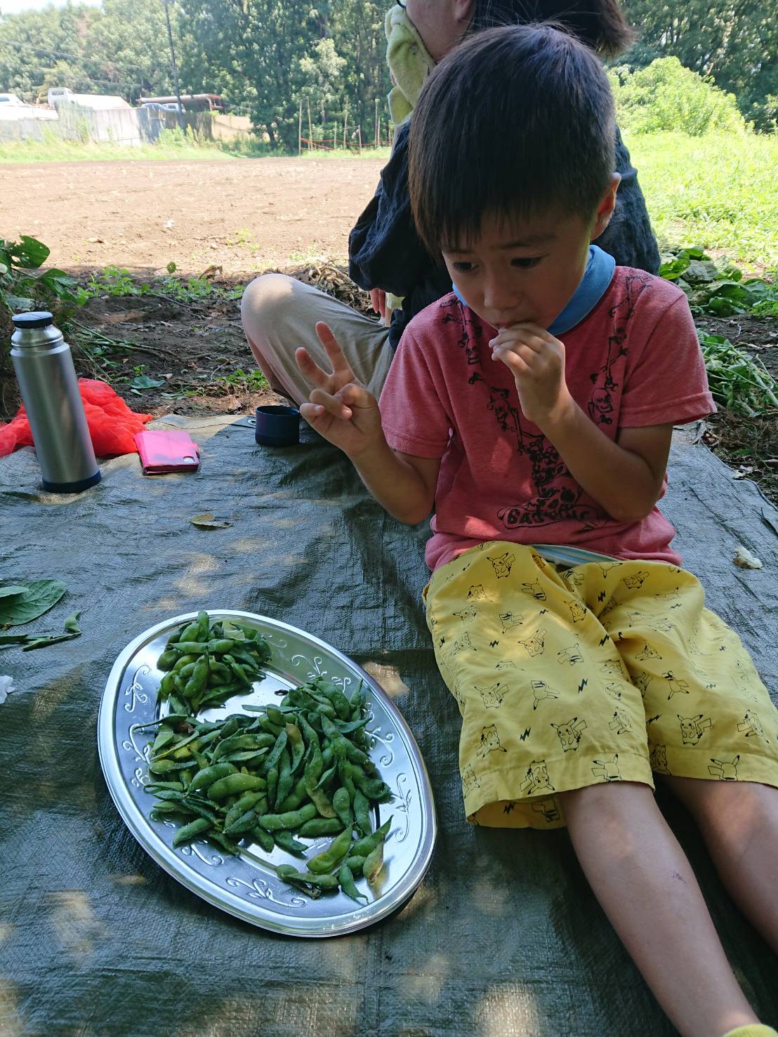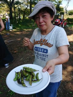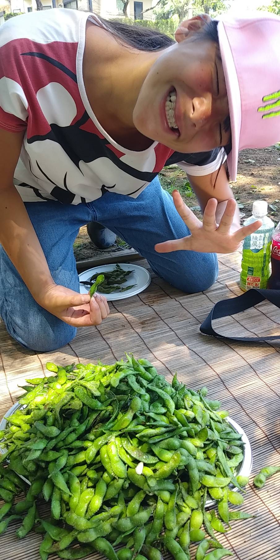 昨日今日は涼しい木陰で、みんなでエダマメ収穫開催w