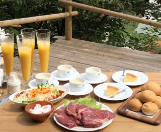 スープ・岡村牛(1名分、どーんとと200㌘)・サラダ・パン・チーズケーキ・焼きマシュマロセットが体験できる贅沢メニュー♬