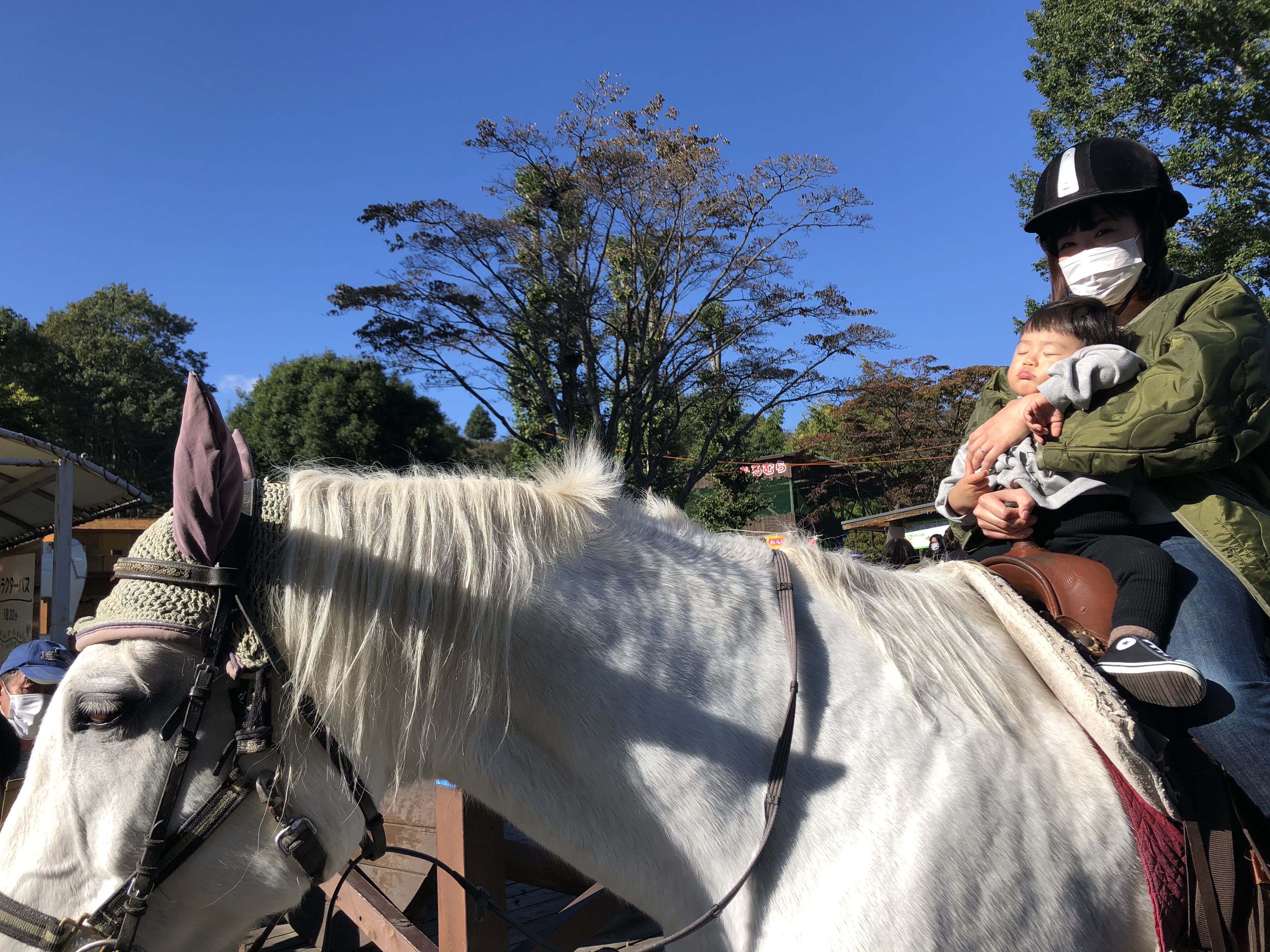 「並んでいる間に寝ちゃいました~、ほらっ、お馬さんに乗っているよ!起きて・・(ガクガク)」とお母さんが呼んでも