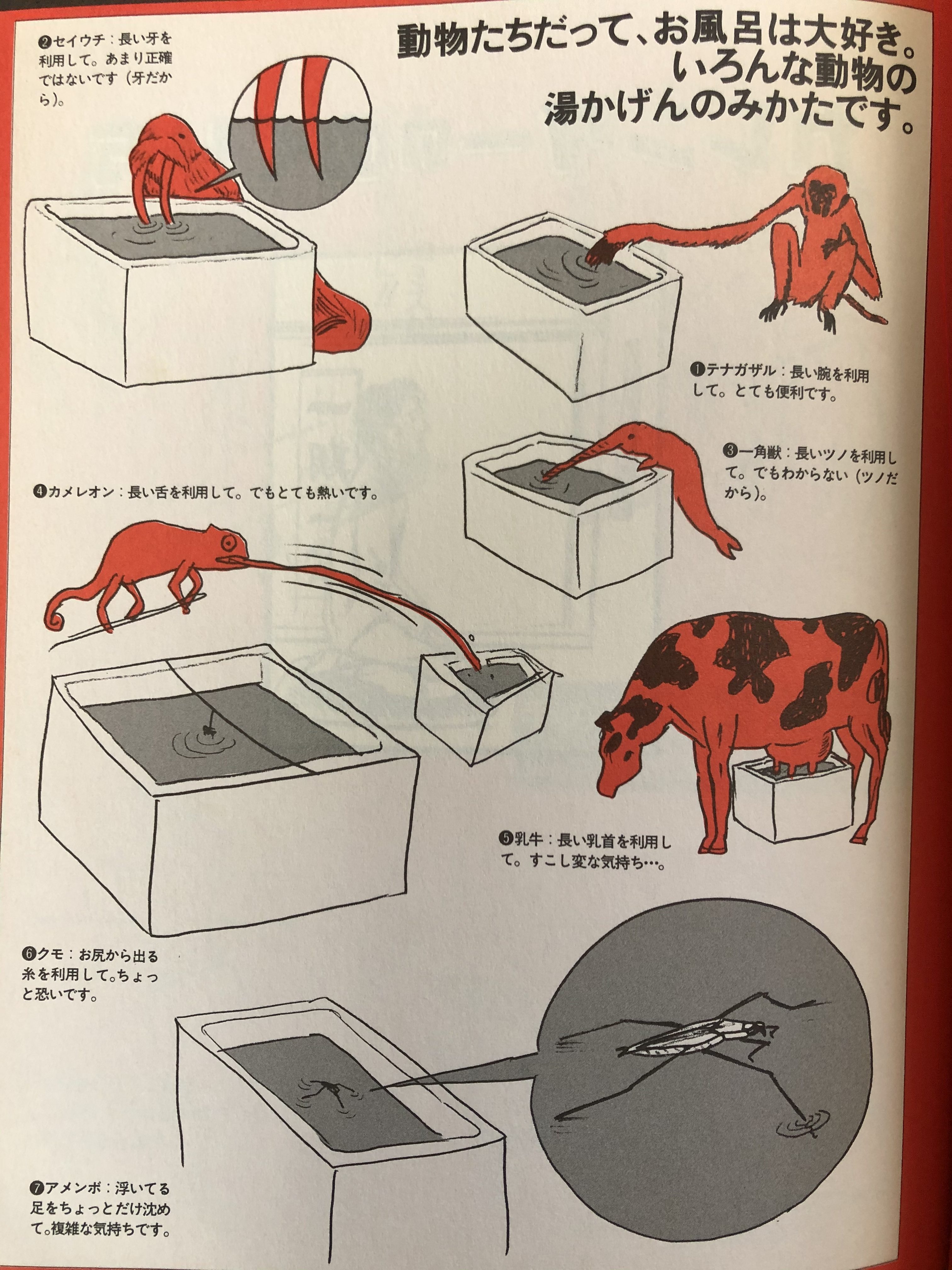 例えば、左上は「上半身を勢いよく湯につけ、悲鳴の大きさで温度が分かる」という画期的な方法。