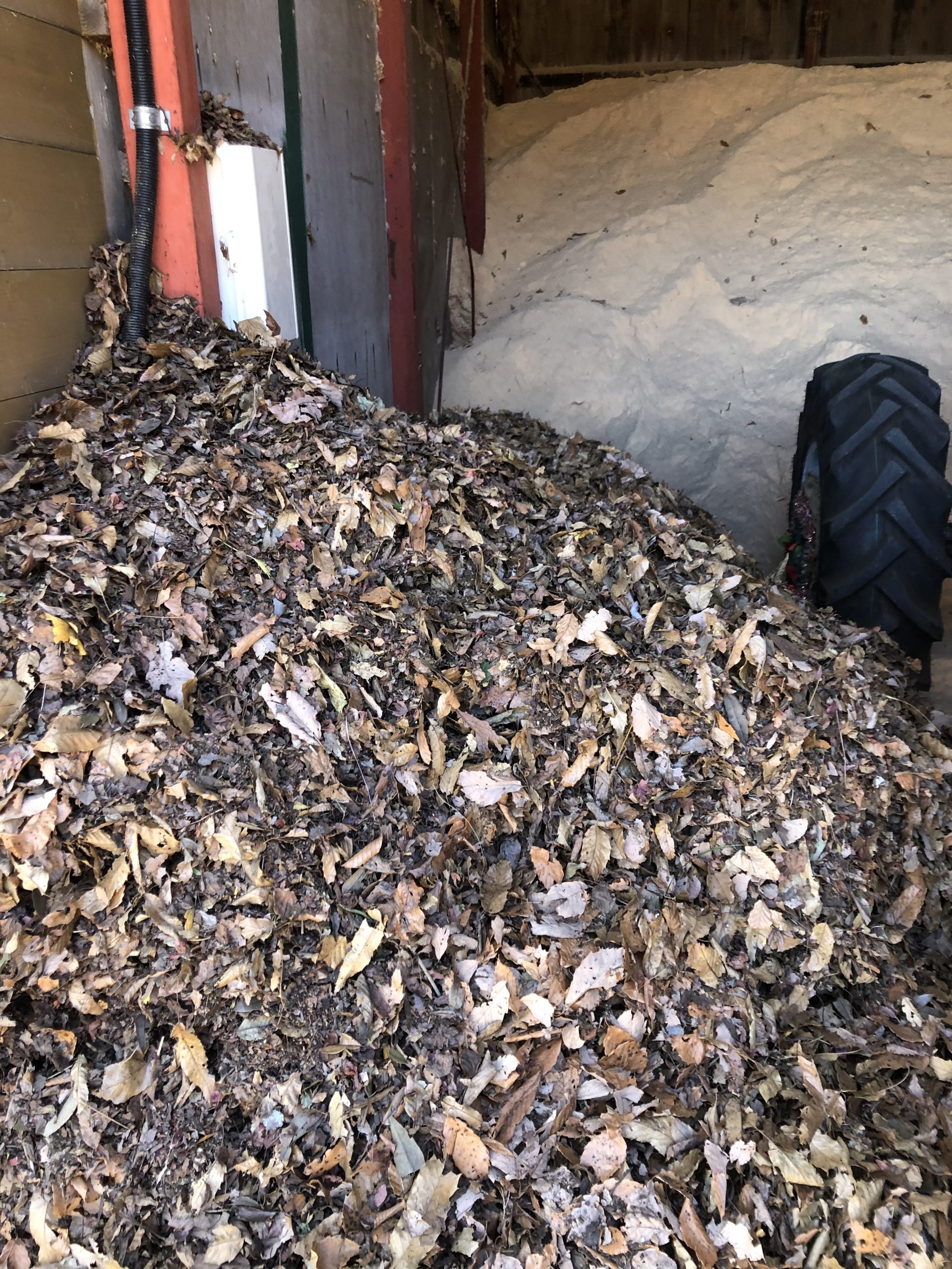 動物の敷料に使うので、乾いた落ち葉は貴重な資源。
