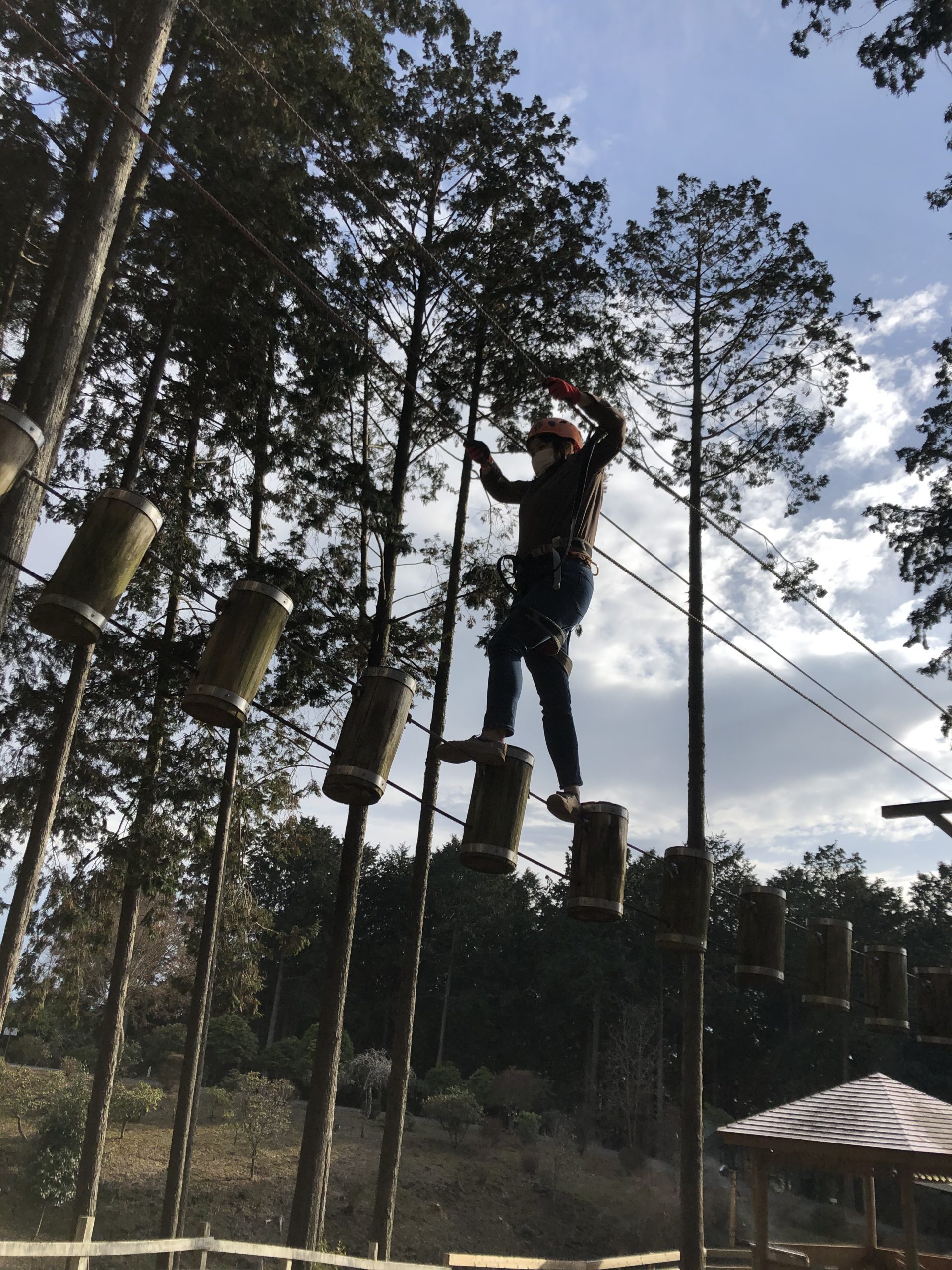 命綱をつけてチャレンジする「大人アスレチック」。