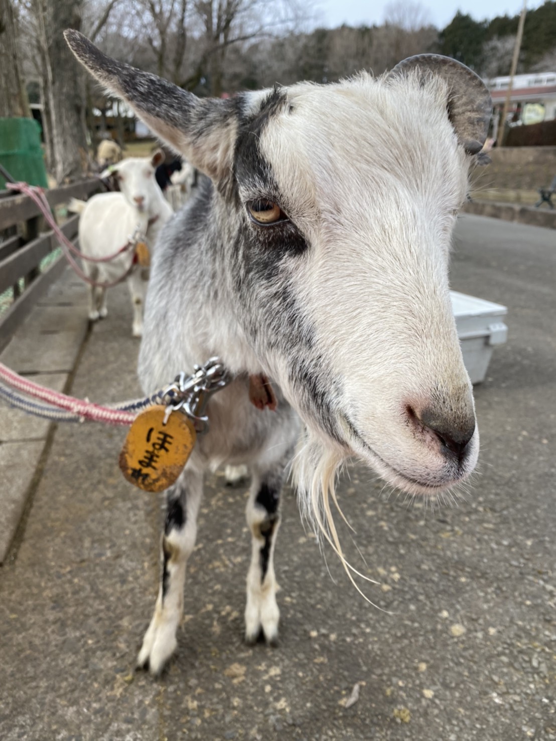 ヤギの名札、お散歩に出る際に装着します。