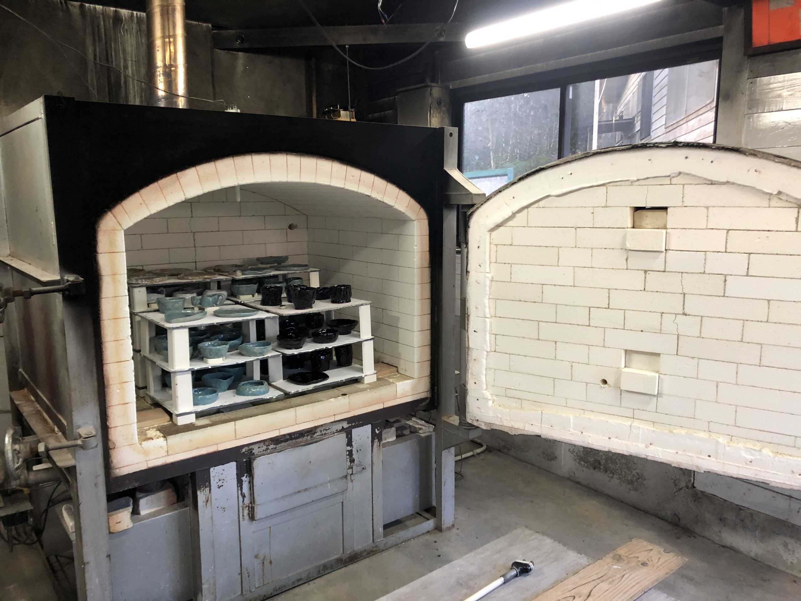 素焼きして硬くなった素材に、釉薬をかけて良く乾かしたあと