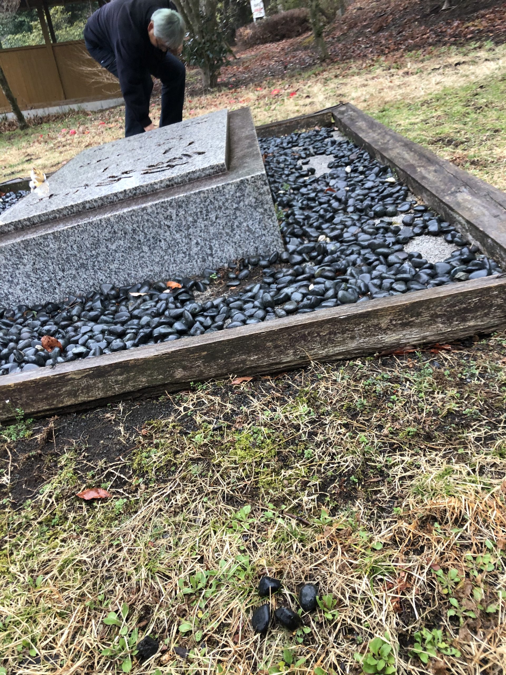 慰霊碑の石碑周りの黒いツヤツヤの石が、毎週10個ぐらいは外の芝生側に飛びだしているのです。