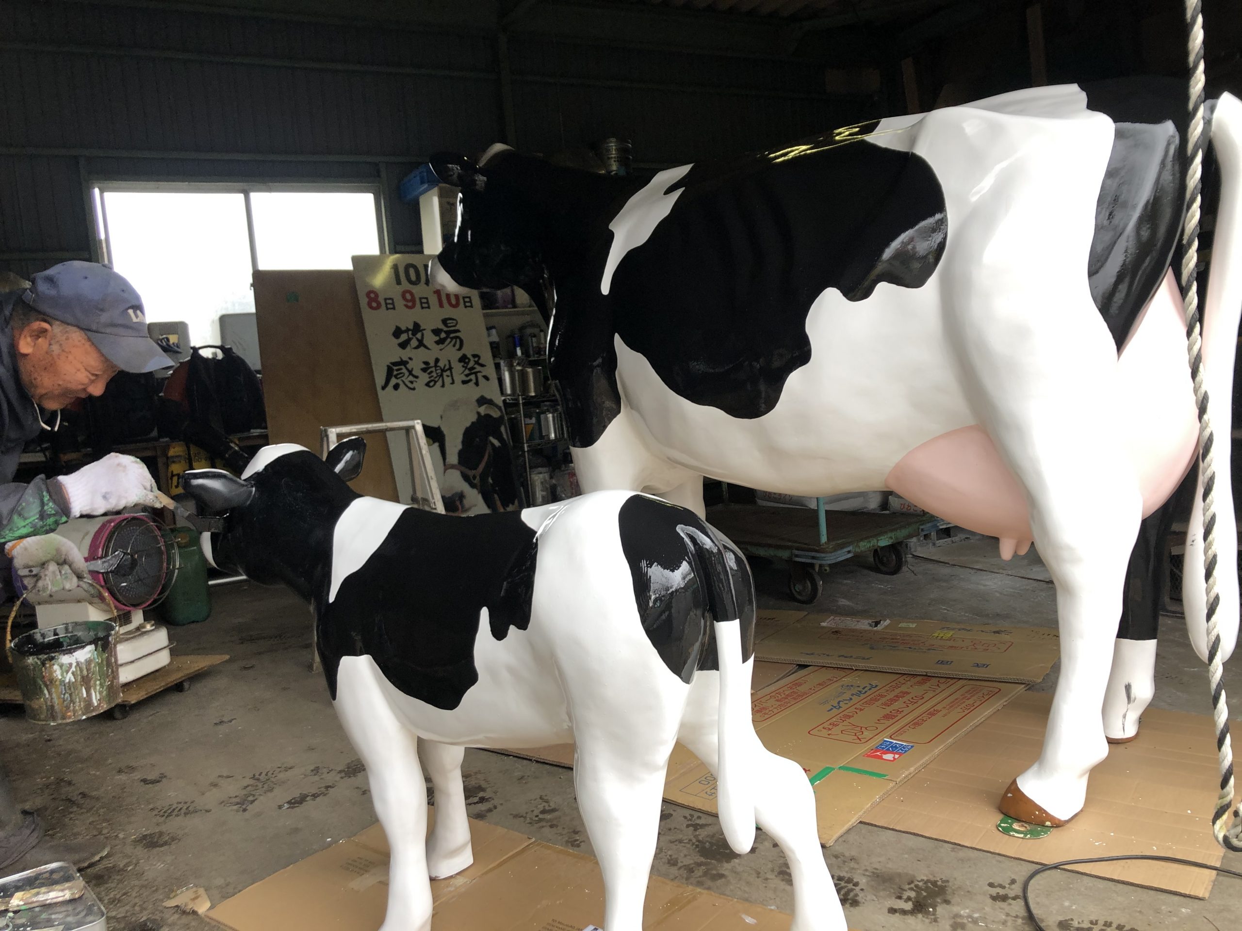 もう直ぐ工事が終わる、表の入り口に再び立つ「親子牛の像」。