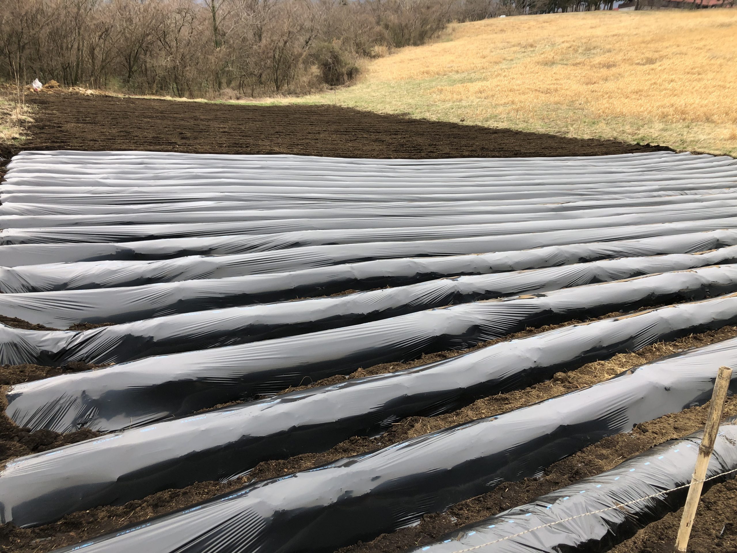 畑でマルチ(ジャガイモ植え付け用)を張りまくる。