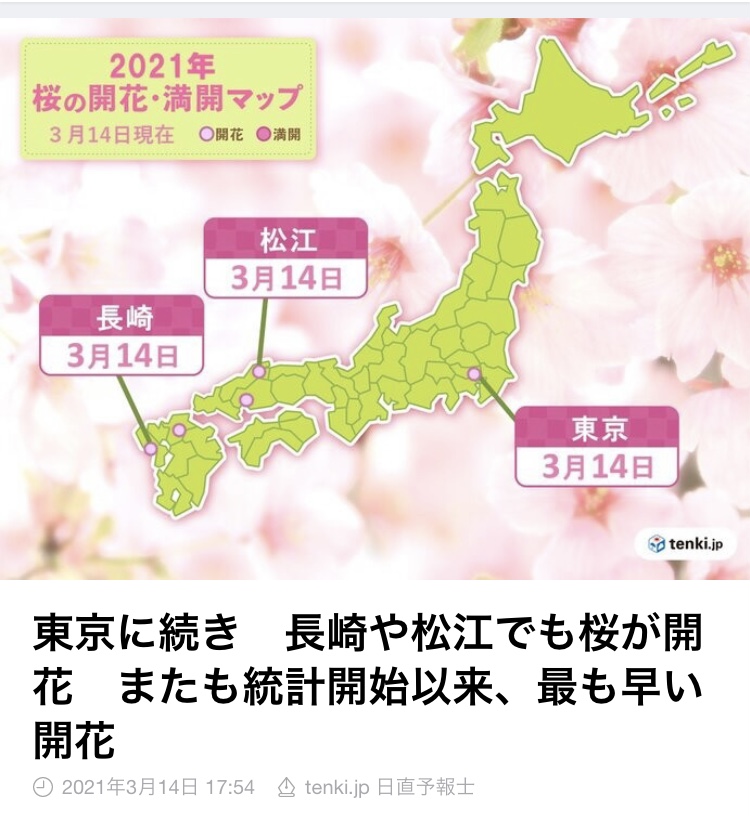 「桜の開花が統計史上、【最も早い春】になりそうだと」