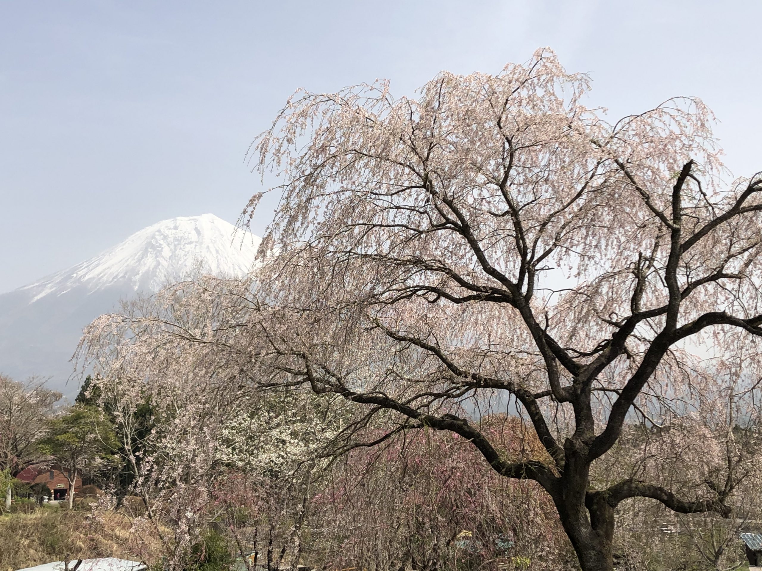 乳しぼり会場のすぐ上の桜は、桜と富士山で撮れる場所。