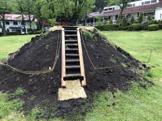 土の山の真ん中に階段有。