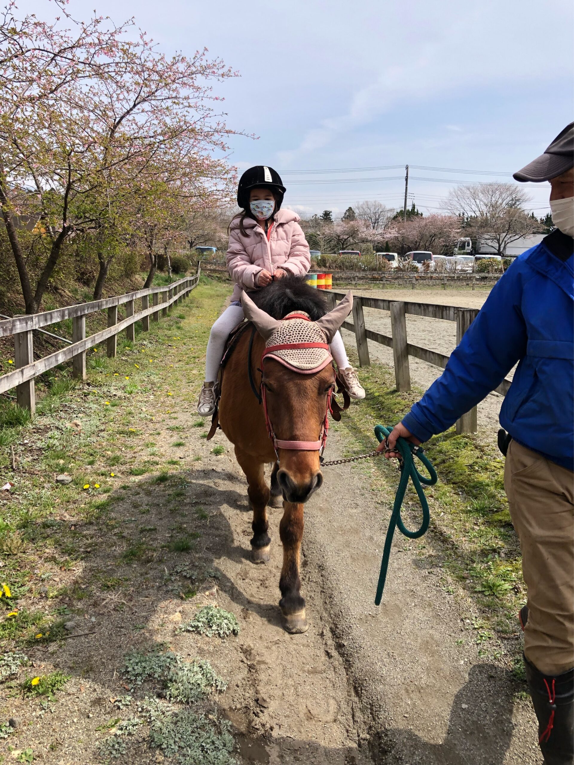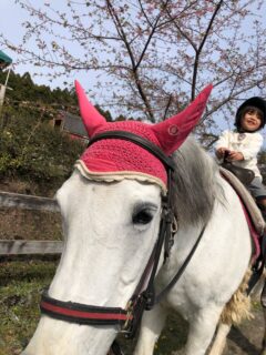 早咲きの桜横を馬で行く。