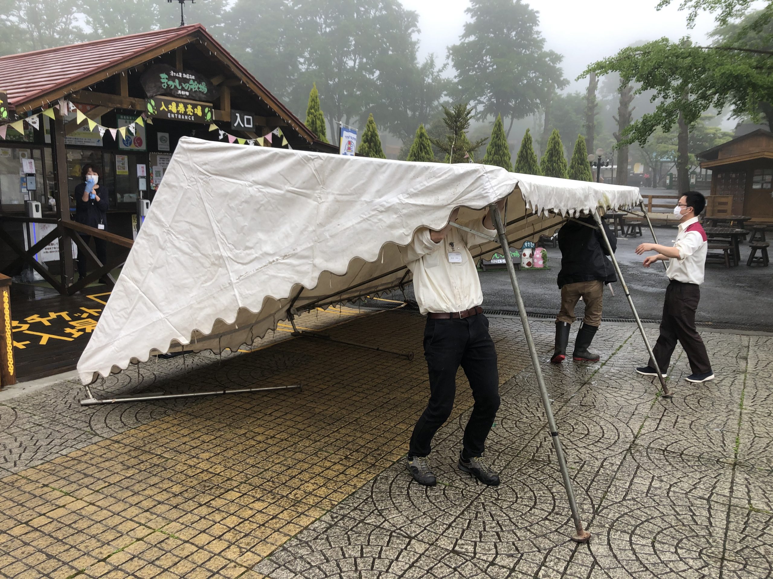 コロナ対応強化のため、入口で「検温・連絡先記入」をするテントを出しました。