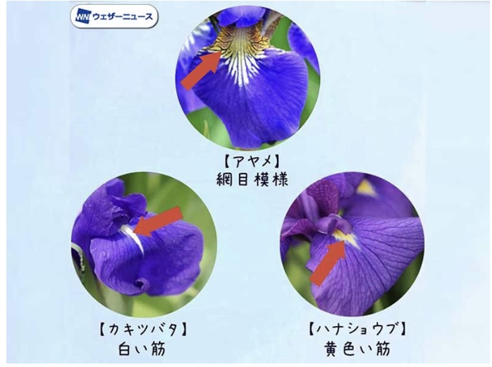 アヤメは花の付け根に「綾(アヤ)の模様」があるから「アヤメ(綾目)」。