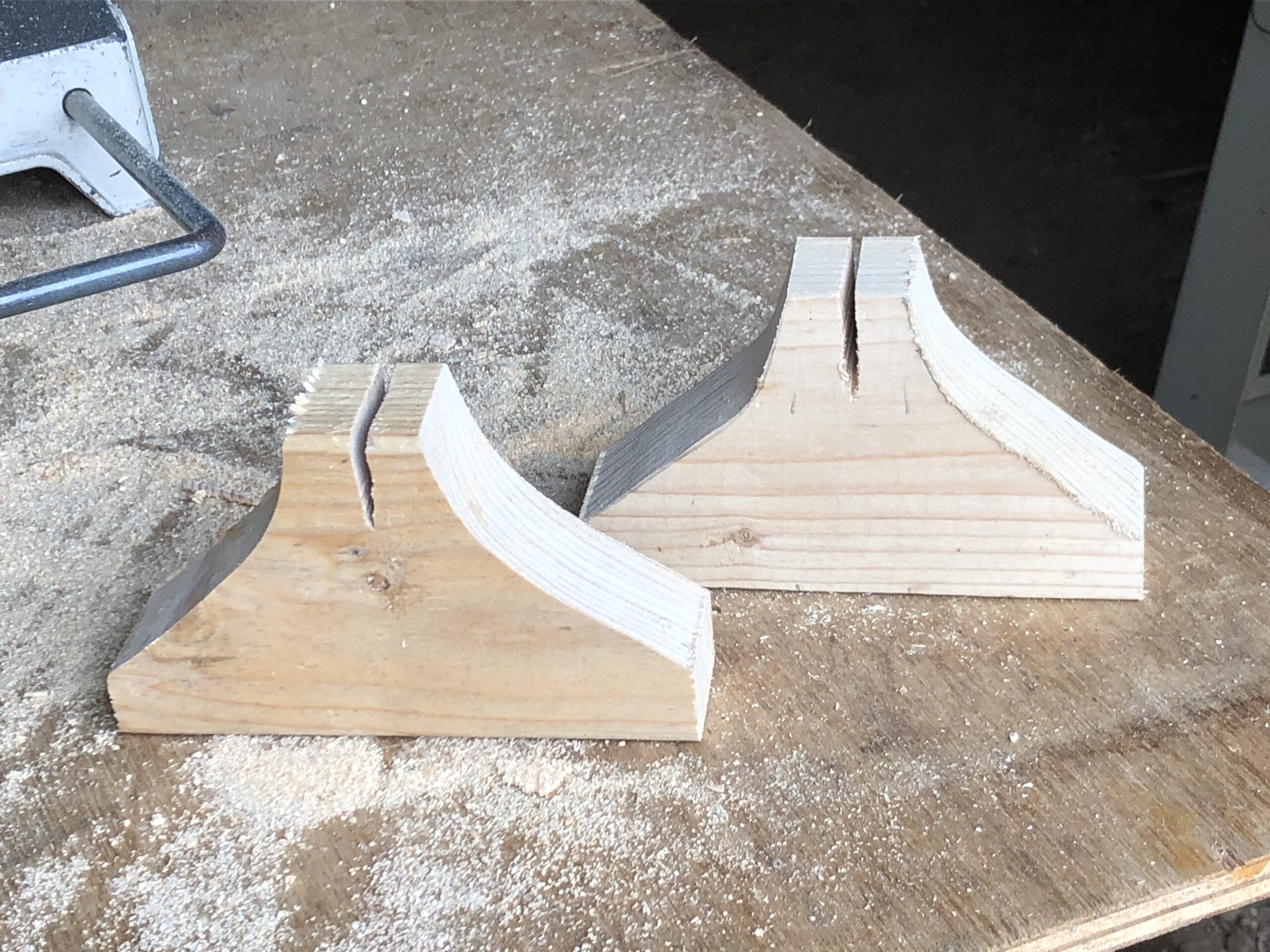その回答がこの工夫。下に、蝶番1個と木の板1本、先にL字の板をフック代わりにして取り付け。