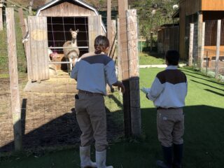 タカダお姉さんと一緒に牧場中のトレーを集めて
