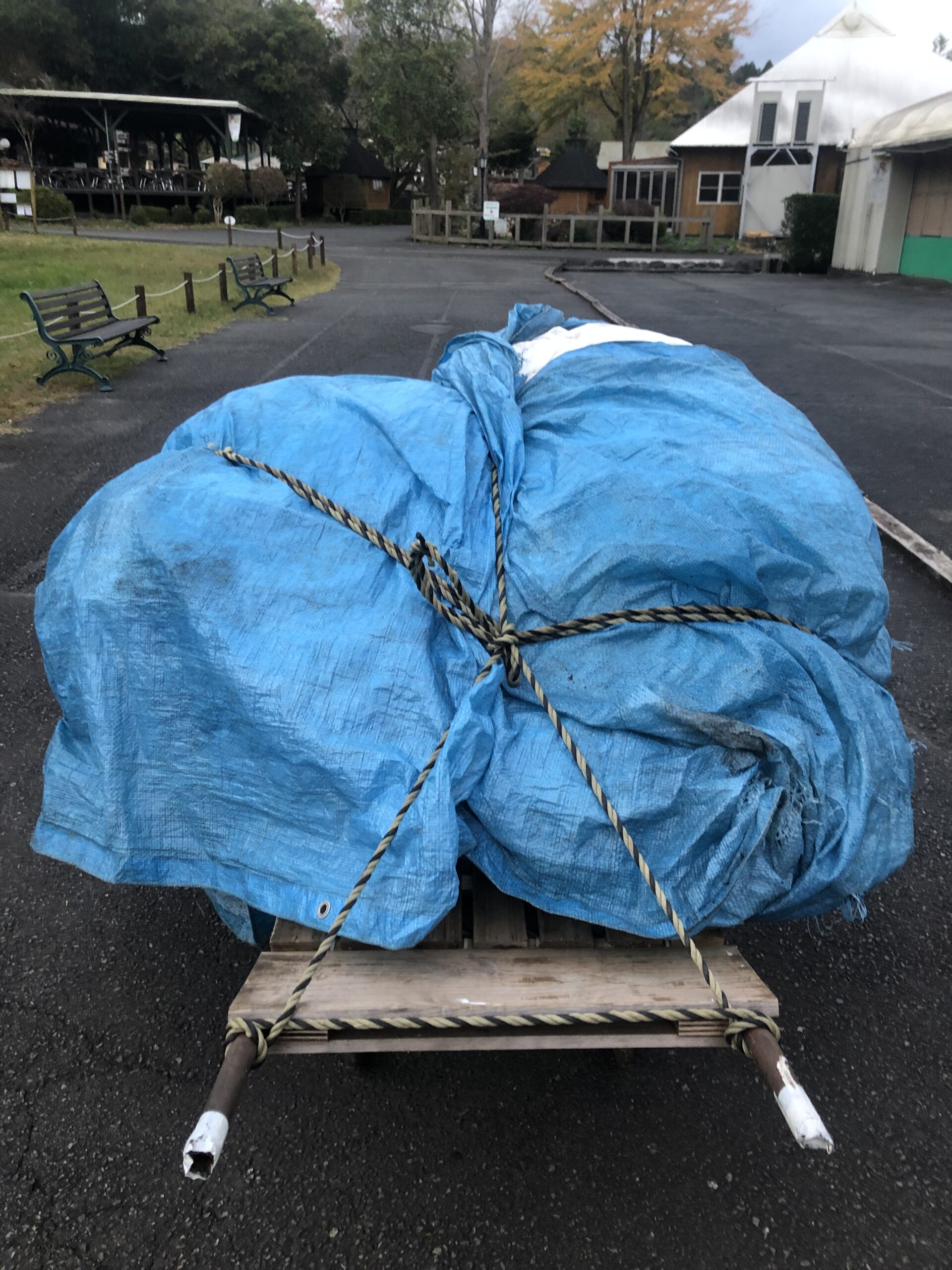 でも応援を頼める人も近くにいなくて・・その辺にあったシートやロープや台車でなんとかする。
