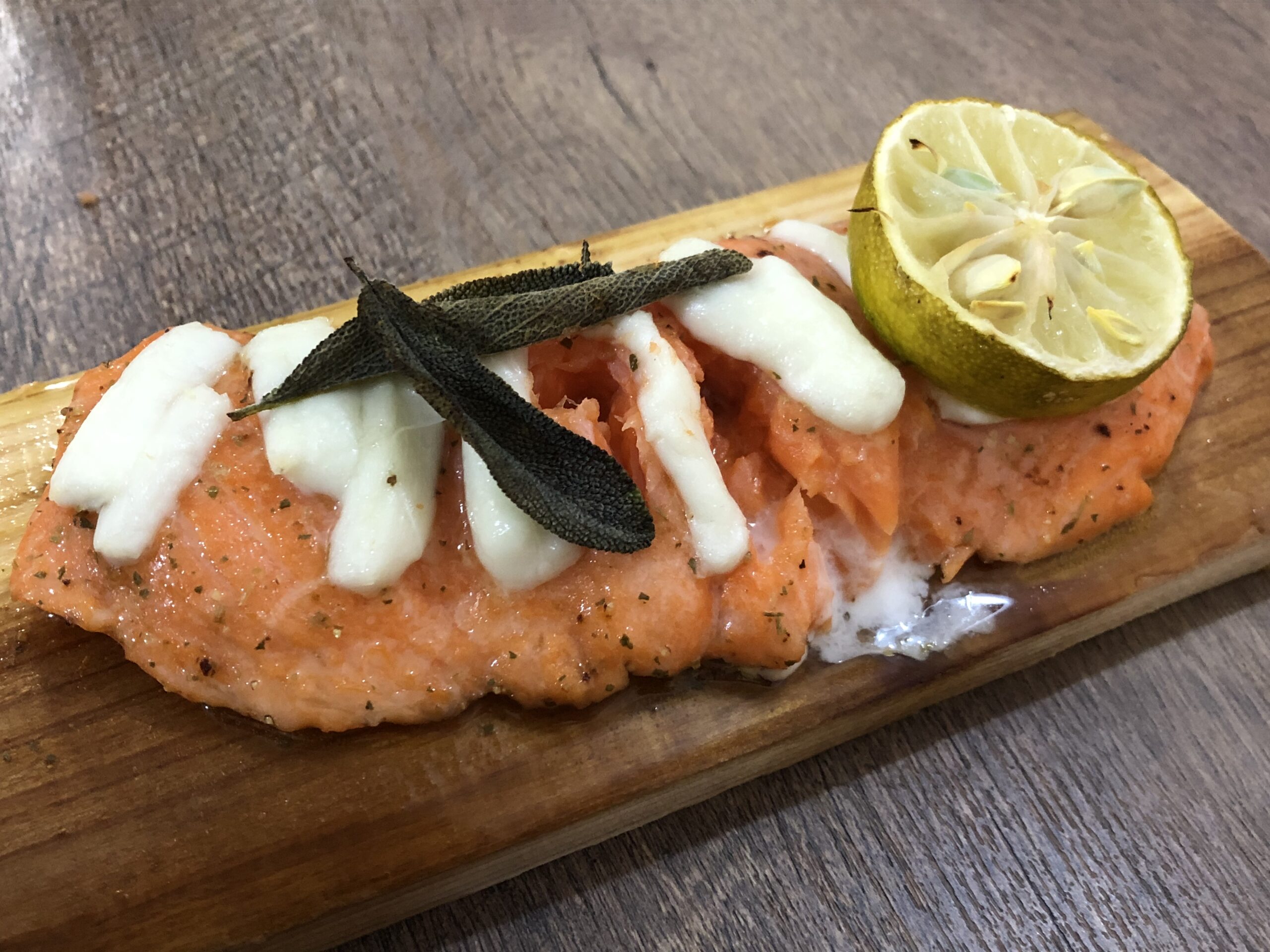 水やお酒をたっぷり吸わせた木板の上に食材を乗せ、オーブンで150度20分ほど焼き上げるお料理w