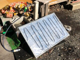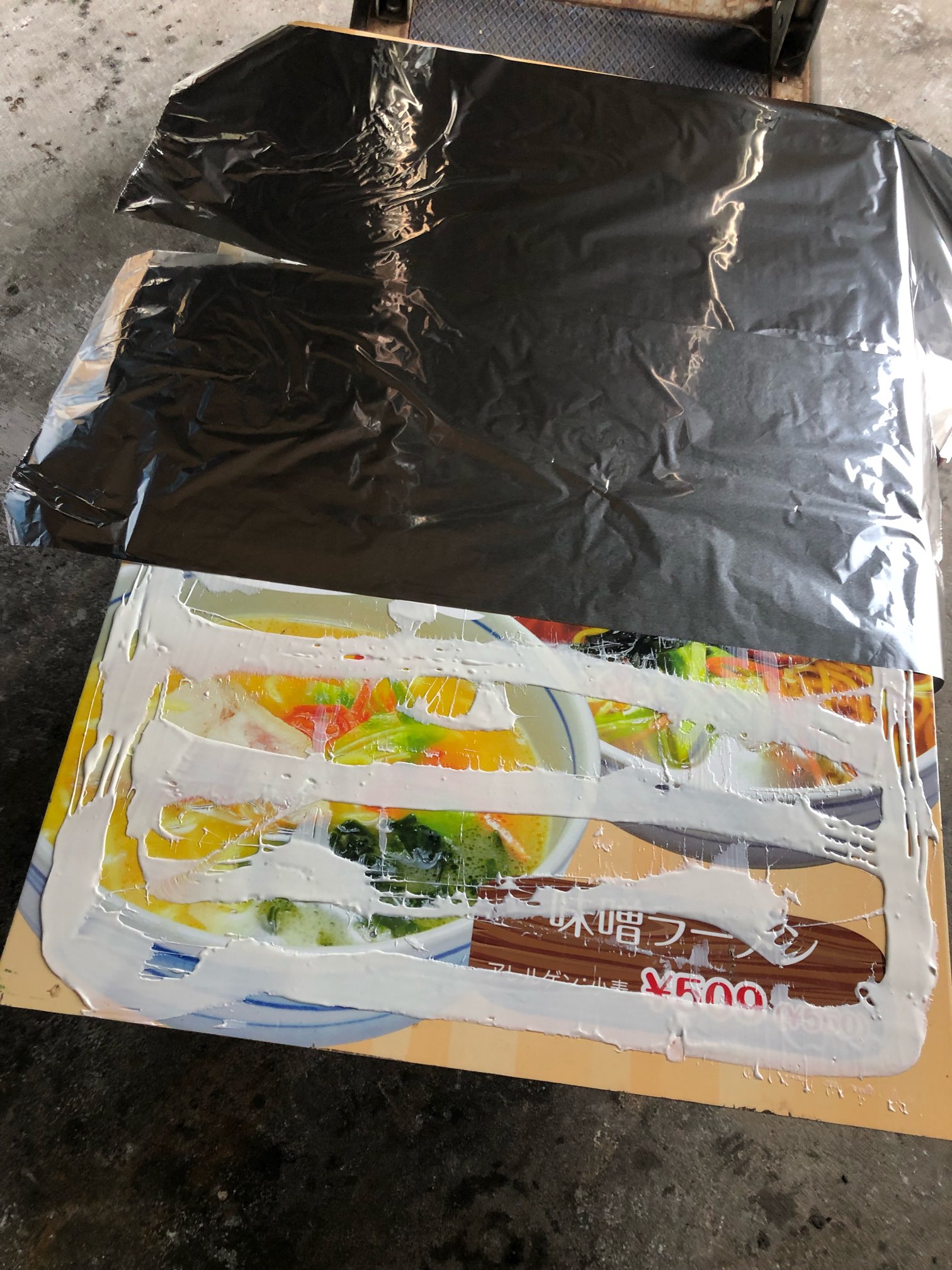 不要になった看板に、ボンド塗ってアルミホイルを張り付ける。