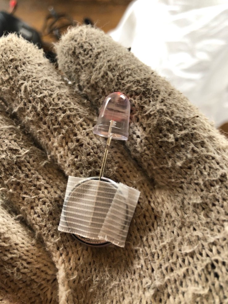 発光ダイオードにボタン電池はさんで、テープで留めただけ。