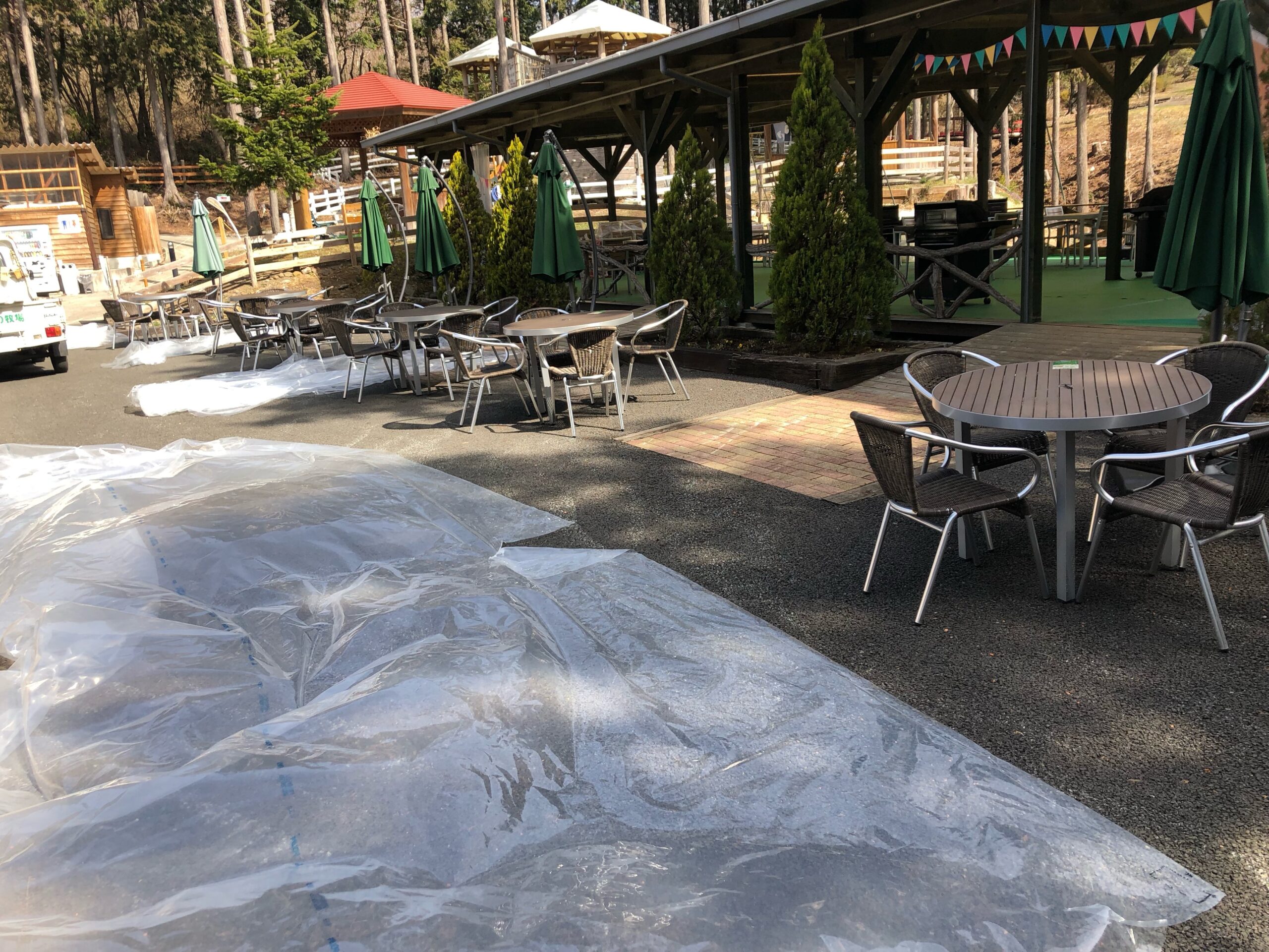 森の隠れ家のBBQテラス、風よけシートを取り外す。