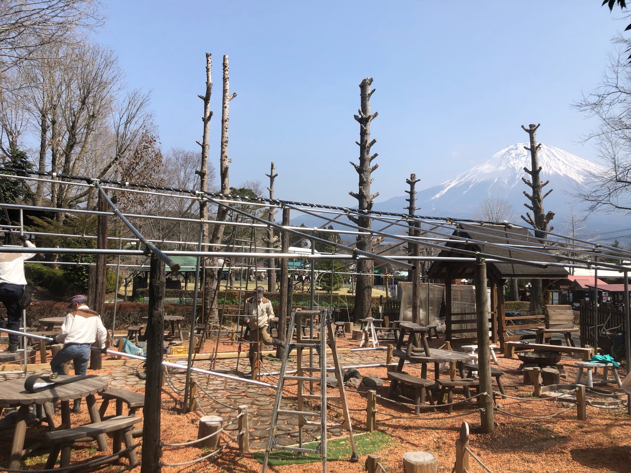 ラジオ放送で使う為、急ピッチで「青空テラス」の屋根張り作業が進行中でした。