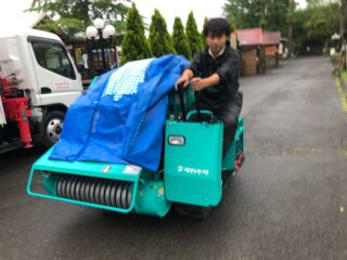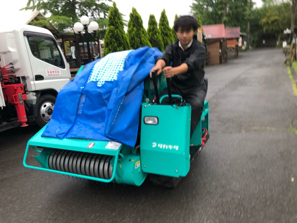 草を集めながらロールを作る機械を動くようにしたマツキお兄さん。