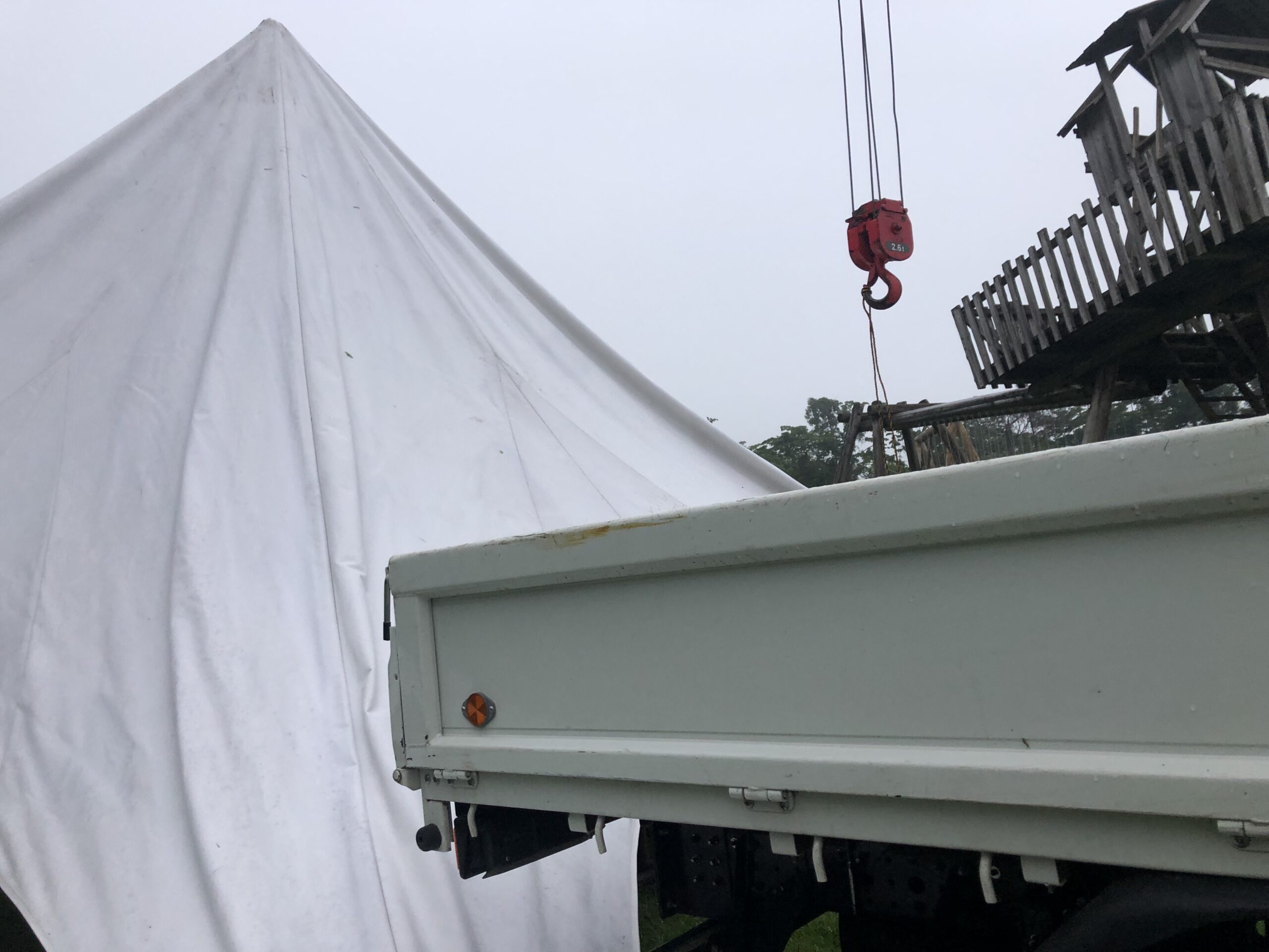 真ん中の1本の棒を立てる際は、人手で行うにはかなり無理がある。
