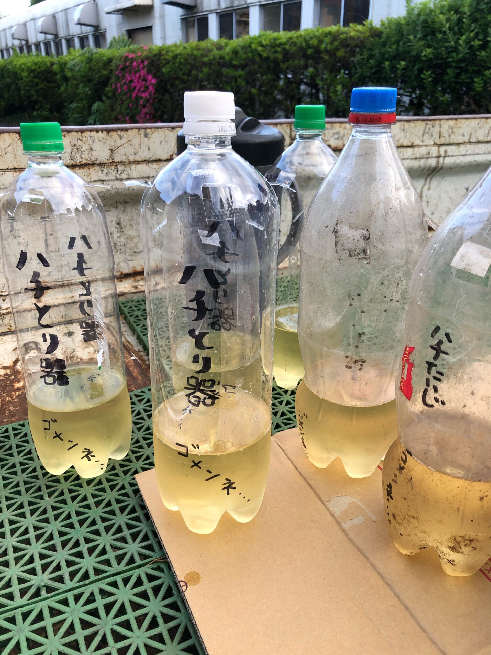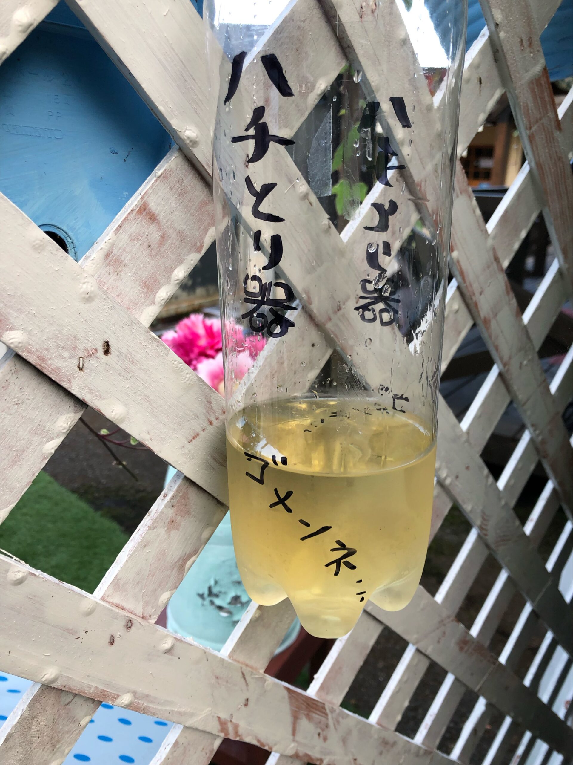 匂いに誘われて中に入ったスズメバチが、液にドボンと落ちて飛べなくなり窒息。