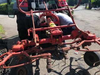 マツキお兄さんと馬飼野社長が、一緒に集草機をトラクターに取り付け中の1枚。