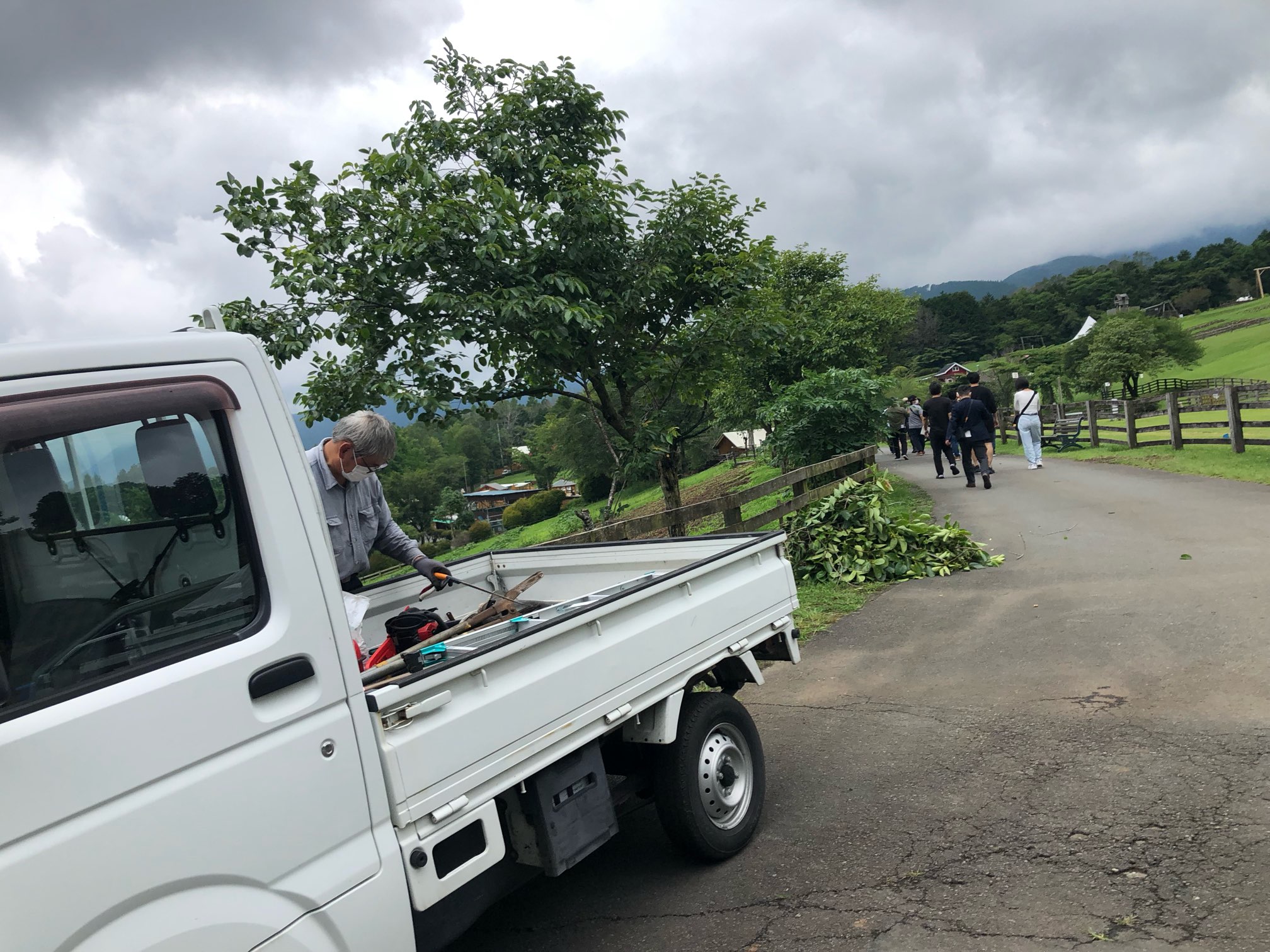 場内中の木の、下に下がったうっそうとした枝を切りまくる馬飼野社長の横を