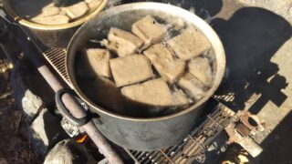 固めのゼリーぐらいになったコンニャクを、茹でるとしっかり固まります。