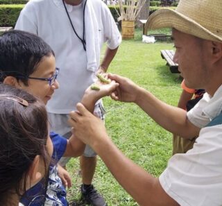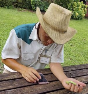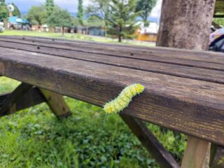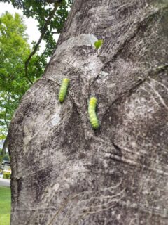 刺したりしない、ヤママユ(ガ)のイモムシ。