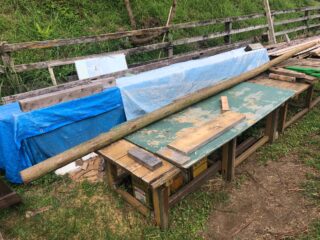 駐車場の一番奥に位置するこの林から、細目の木を一本切り出す。